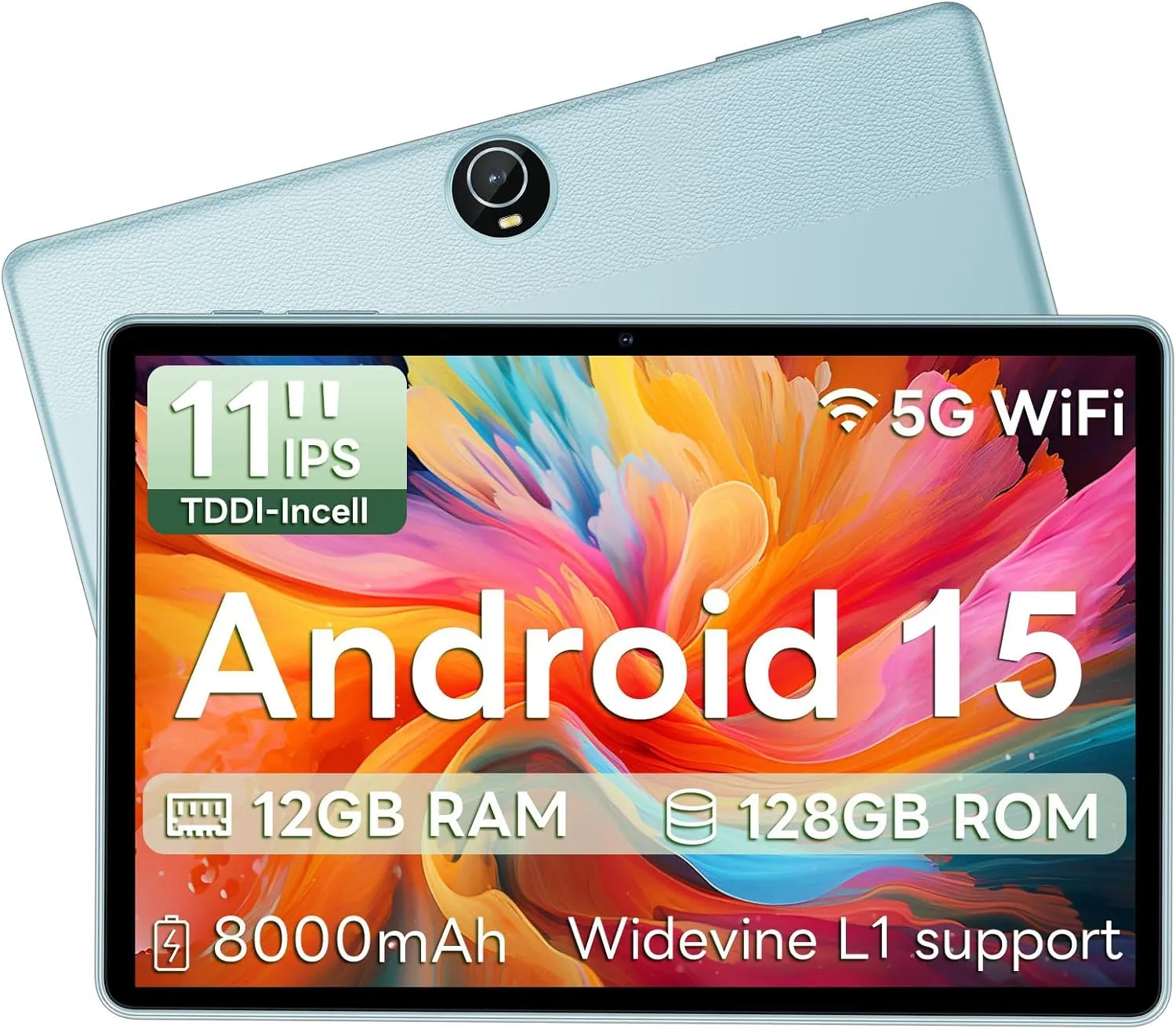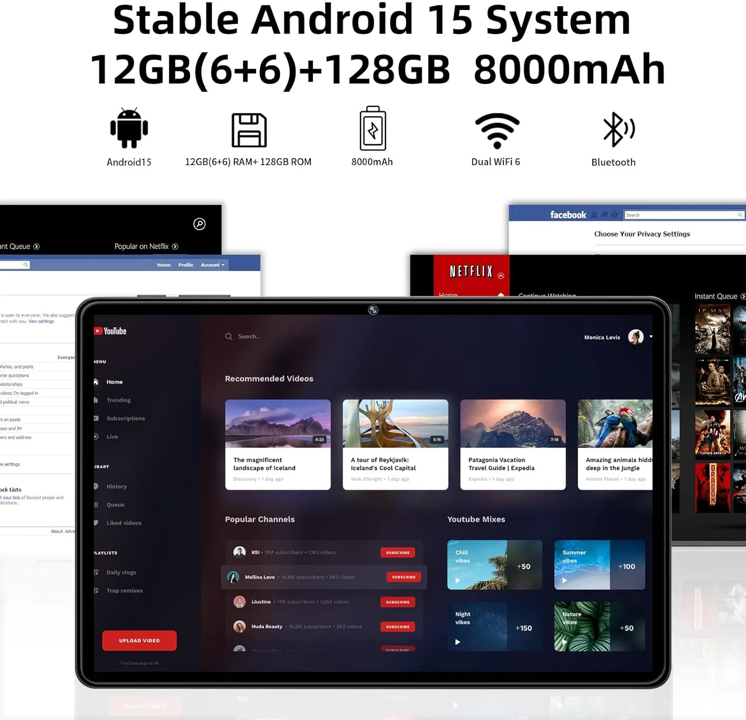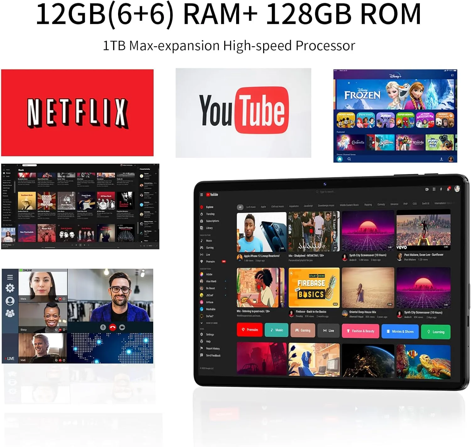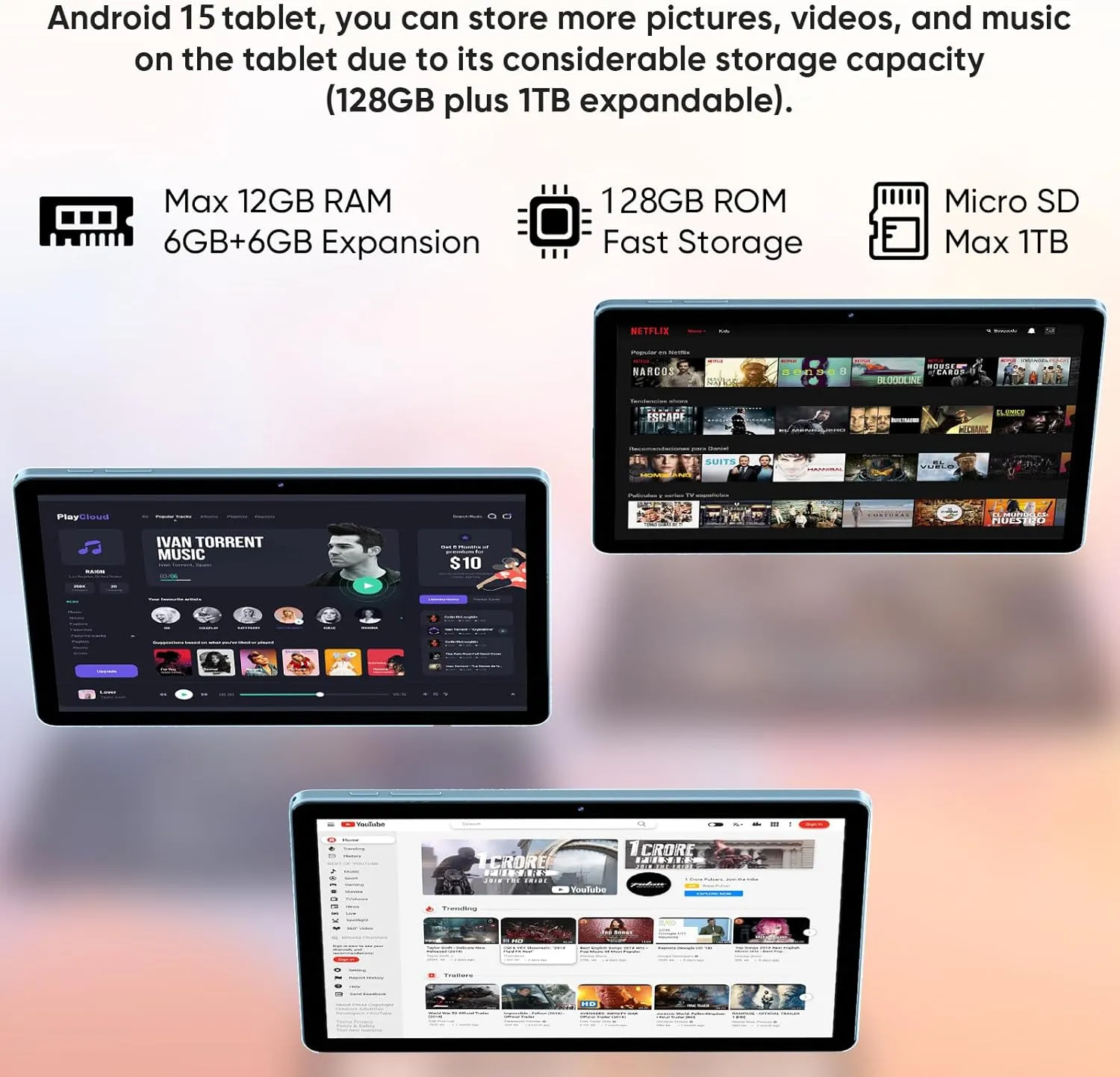 【BIGGER THAN BIGGER】The 11inch tablet futures12GB(6GB+6GB) RAM, 128GB internal storage and expandable storage up to 512GB. The GMS Certified latest Android 15 Tablet, with basic Google apps already on and without bloatware. Get rid of unexpected ads and download apps from Google Play, such as SKYGO, YouTube , Netflix, and more.