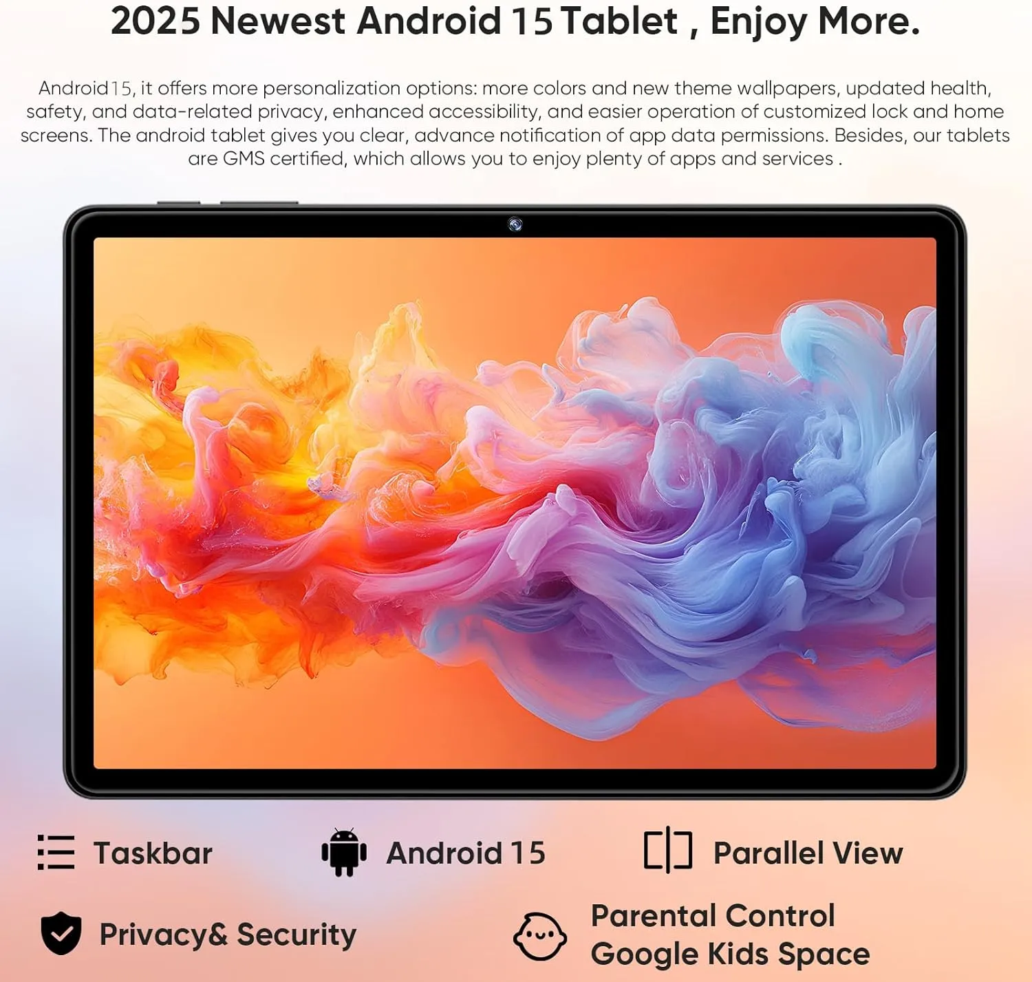 [Parental Control & Face Unlock]Parental control helps children manage their time, balance learning and entertainment, and develop good online habits. Android 15 tablet also supports multi-window mode, eye protection mode, 3-finger screenshots and more to make the tablet experience even better. Face unlock functionality gives you convenient access to your wifi tablet.The dual camera allows you to take photos and make video calls.