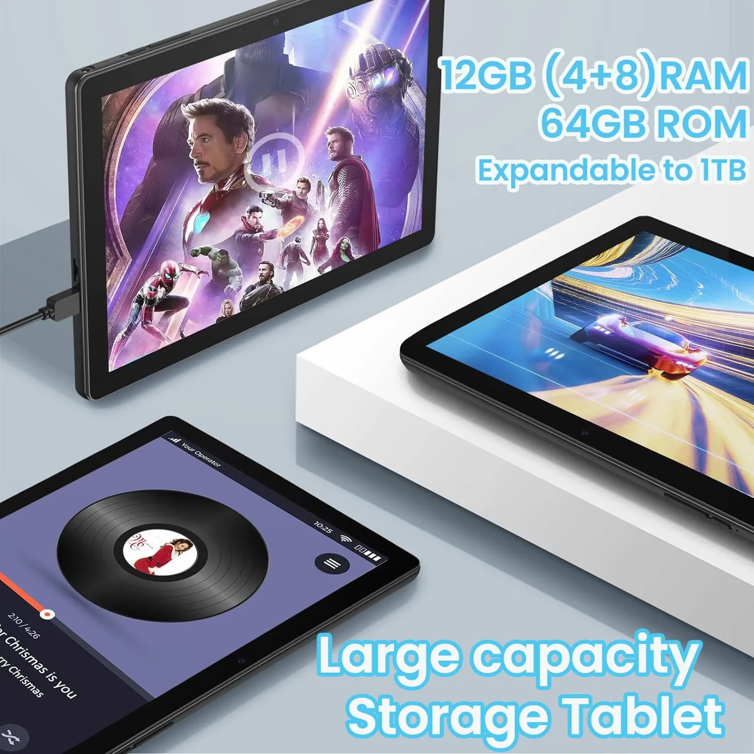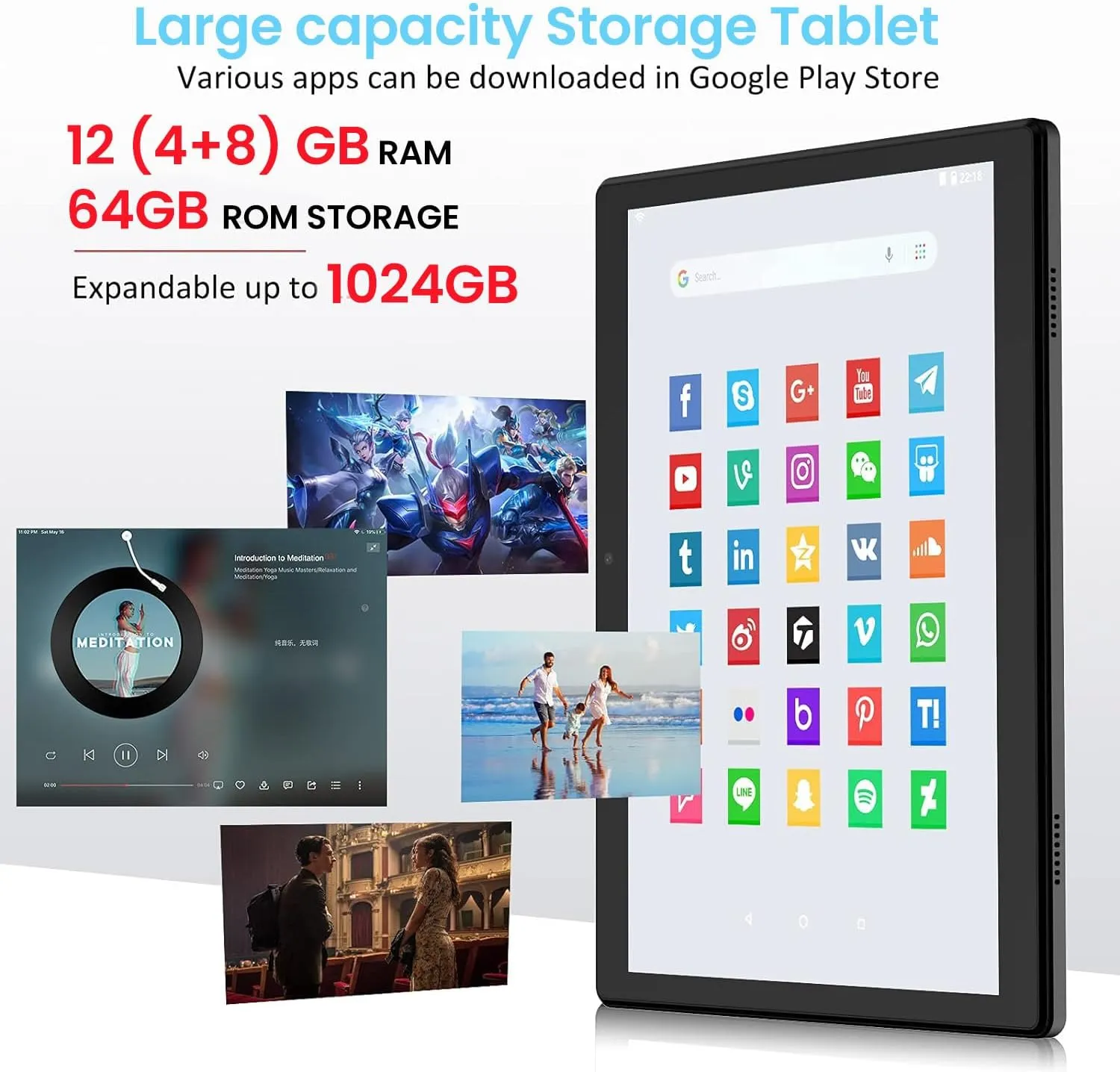 Android tablet with 12GB RAM ( 4GB+8GB virtual RAM) and 64GB ROM, expandable storage up to 1TB of micro SD card, you can stress-freely enjoy photos, movies, online classes, virtual learning, video conferencing, office work, and more.