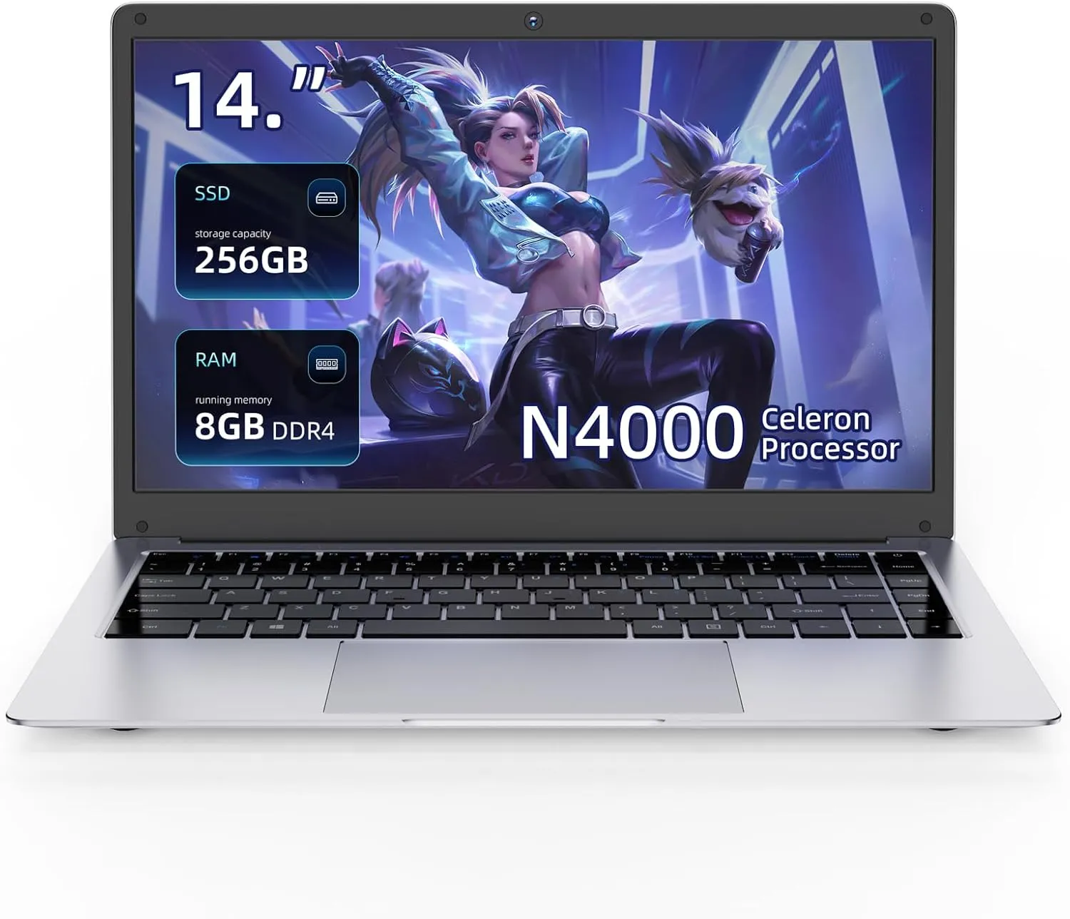 【silvery Large Capacity Laptop】Featuring a powerful Celeron Processor 2.6Ghz clocked, you can experience lightning-fast performance; with 8GB of RAM and a 256GB solid state drive, you can seamlessly run multiple applications and browse the Internet.But this laptop may not be suitable if you are using it for big games.