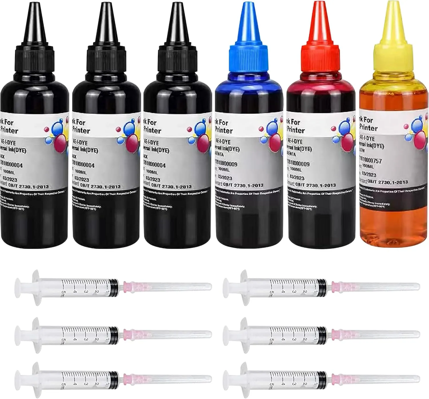 You Can Receive: 6-Pack 100ml bottle of Universal refill ink dye ink (3 Black, 1 Cyan. 1 Magenta, 1 Yellow), 6 pcs syringe and needle