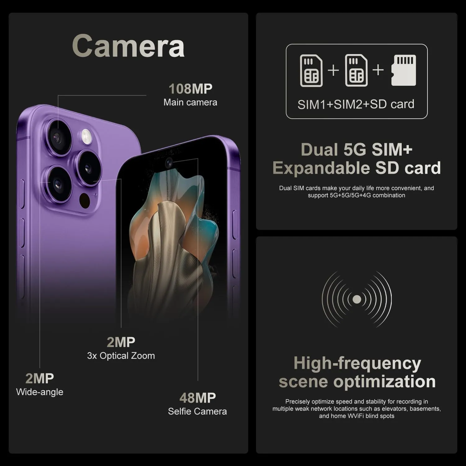 【Excellent camera function】Unleash your photography potential with the powerful 48MP + 108MP dual camera setup of our smartphone. Helps you capture and record the most exciting and memorable moments in high-quality images or videos, perfect for indoors and outdoors. Extraordinary clarity records precious moments in life. Say goodbye to blurry, low-quality photos – with this smartphone, you can capture and share truly eye-catching high-resolution images. Let the outstanding features of our smartphone dual-camera setup make your photography skills shine.