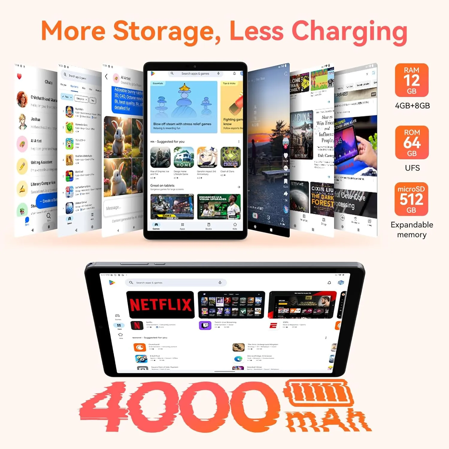 【12+64GB (512 extandable) Storage + 4000mAh Battery】 This 4G LTE tablet combines 4GB RAM + 8GB virtual RAM for smooth performance. With 64GB storage (expandable to 512GB) and a 4000mAh battery, this entertainment tablet stores more and charges less