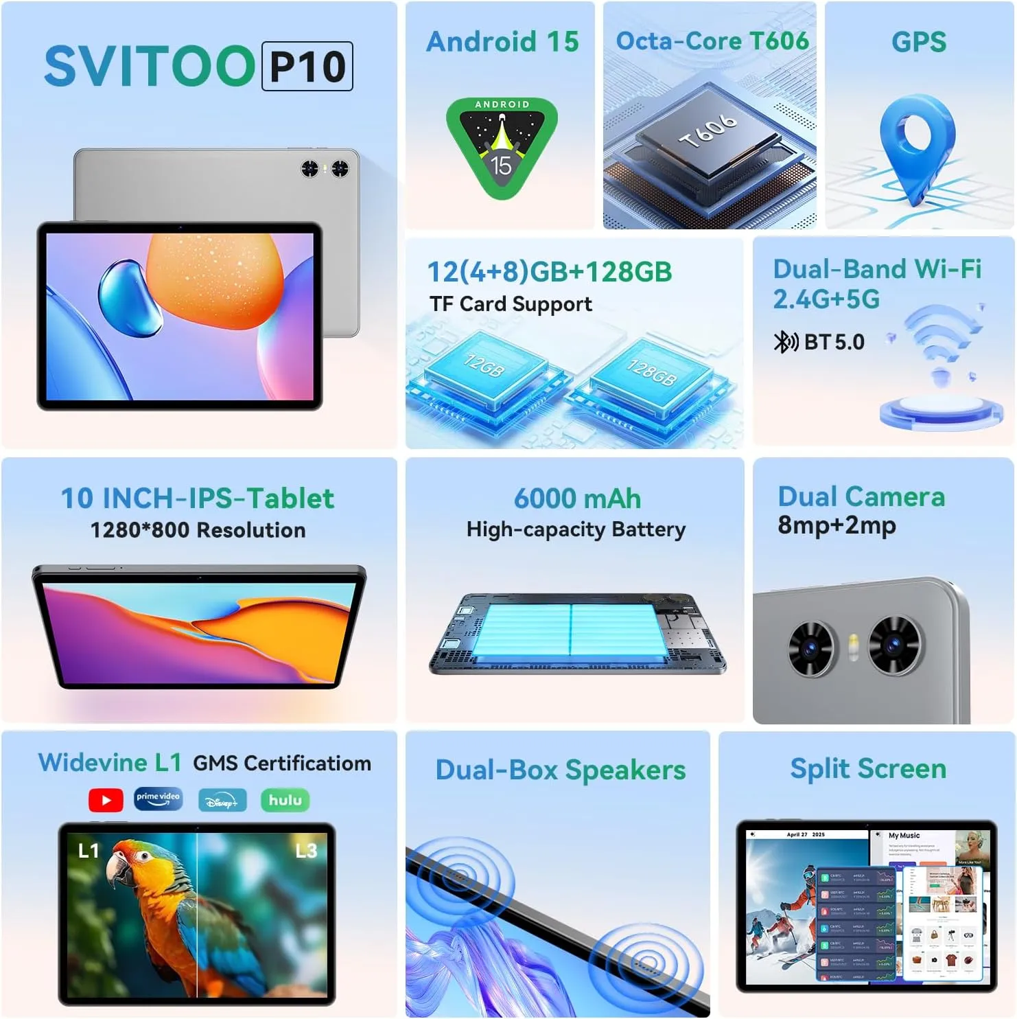 [ Widevine L1 HD Streaming Certified+8MP Rear Camera + 2MP Front Camera ] Widevine L1 for HD streaming on platforms like Youtube, Netflix, Amazon Prime Video, Disney+, and Hulu. Built in GPS for travel & outdoor navigation ensures easy location tracking and directions, making it ideal for in car navigation. dual cameras: front facing 2 megapixel camera for clear video calls and conferencing; rear 8 megapixel camera with enhancements for high quality photos and videos.