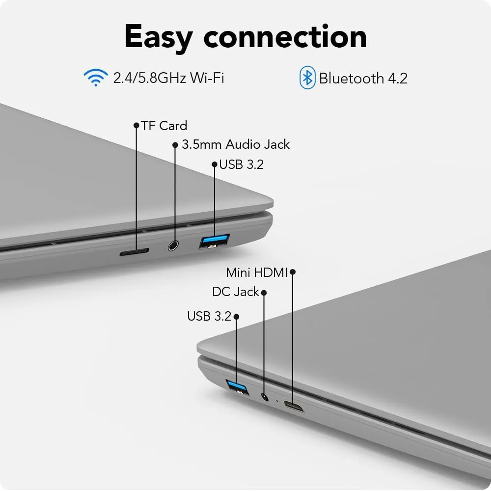 [Portable and Versatile Connectivity]: Weighing just 1.7kg and measuring 20mm thin, this ultra-thin laptop offers convenient portability. Enjoy versatile connectivity options, including Bluetooth 4.2, dual-band WiFi, Mini HDMI, USB 3.2 Gen1 ports, Type-C port, headphone jack, Micro TF slot, and a long-lasting 7.6V/5000mWh battery, catering to all your connectivity needs.Enjoy seamless transitions and effortless adaptability with this versatile notebook.