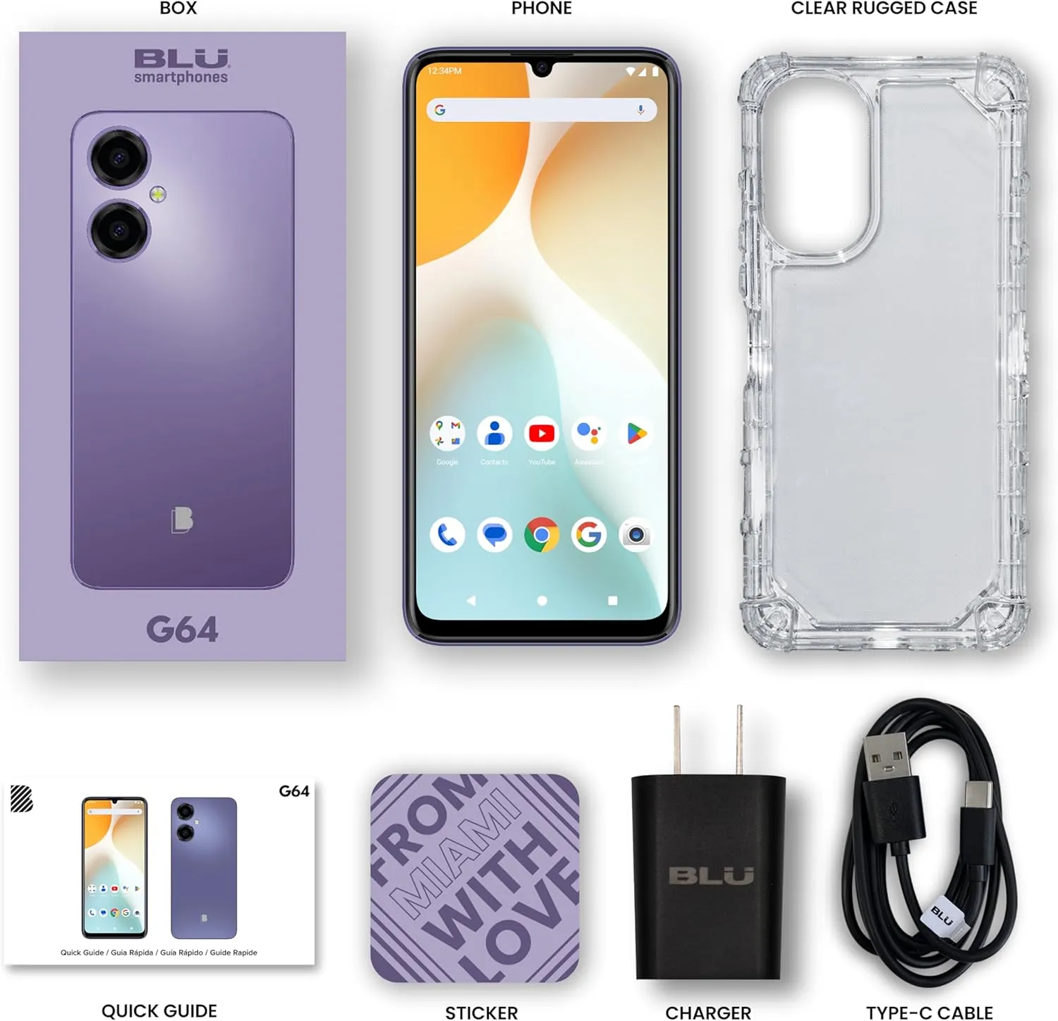 Box Content: G64, Rugged Case, Charger, USB Type-C cable, Quick guide and Sticker.