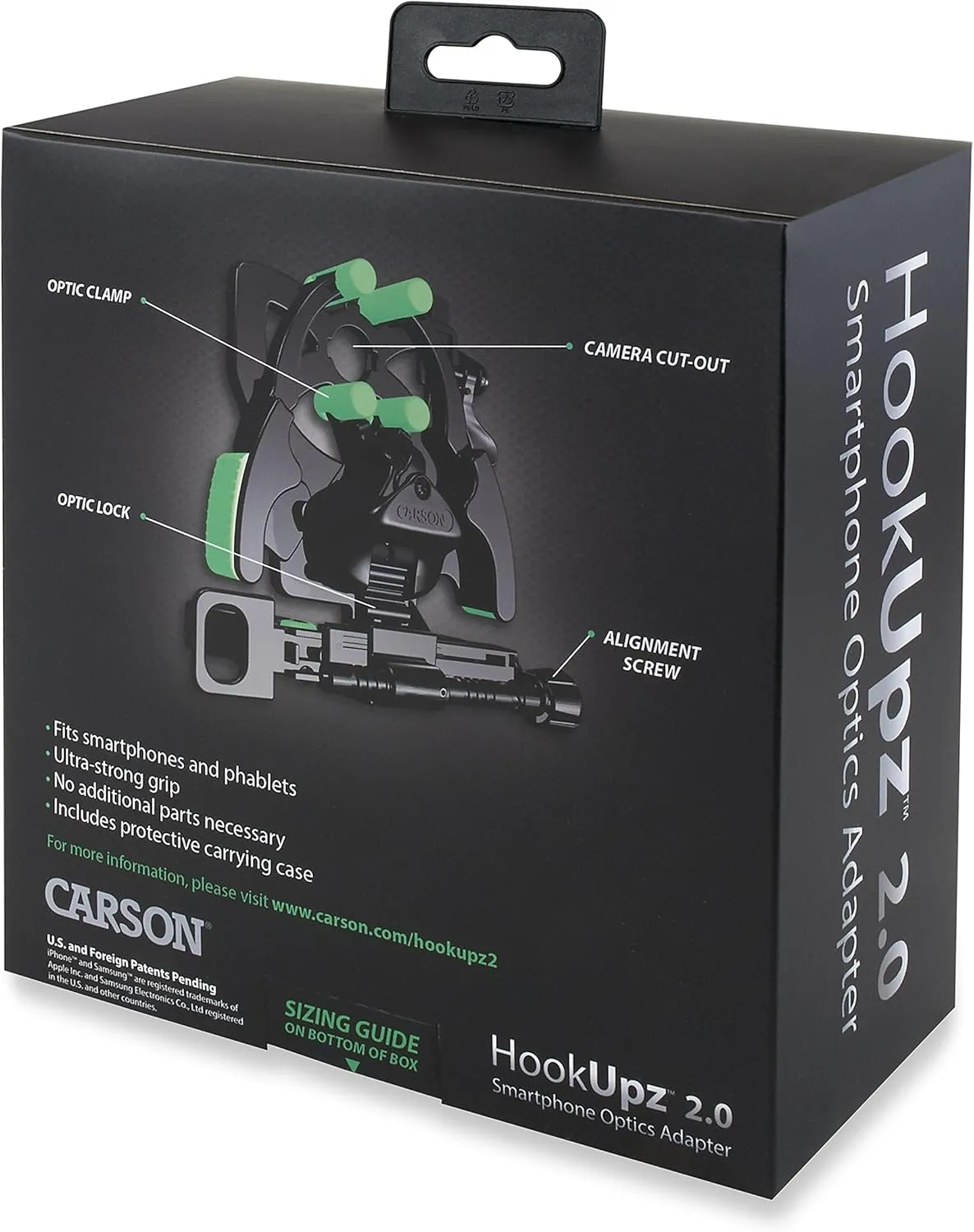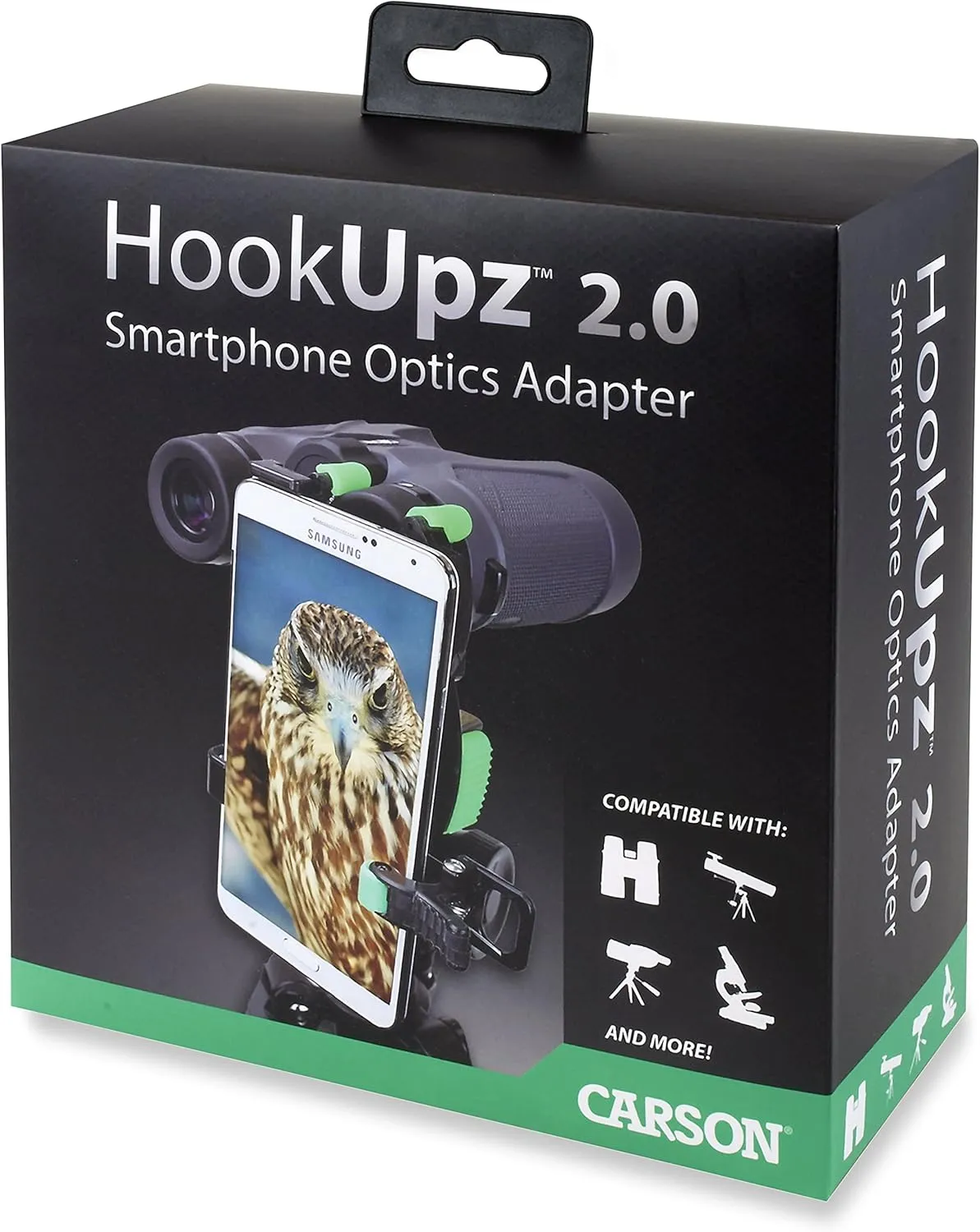 The Carson HookUpz 2.0 Optics Digiscoping Universal Smartphone Adapter is the perfect device for the outdoor enthusiast who wants to be able to take pictures or video through the lens of their favorite optics. Use the HookUpz 2.0 Universal Smartphone Optics Digiscoping Adapter (IS-200) to connect your smartphone to a wide variety of optics including binoculars, spotting scopes, microscopes, monoculars, night vision optics and more!