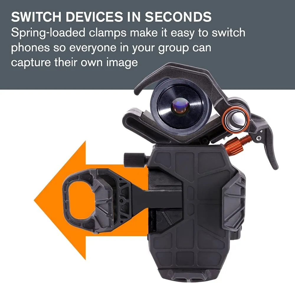Generate a 100-character excerpt from the product description below. Return ONLY the excerpt text, without any prefixes, notes, or explanations. Example: “Compact wireless speaker with 12-hour battery life and waterproof design.” Product description: NexYZ fits any eyepiece from 35 mm to 60 mm in diameter including telescopes with 1.25” and 2” eyepieces, spotting scopes, monoculars, and binoculars. NexYZ will also attach to microscopes with the addition of the included adapter ring, which takes the usable diameter down to 25 mm, the size of a standard microscope eyepiece. A strong spring and a threaded twist lock provide a two-level strong and secure grip on the optical instrument’s eyepiece so you can image with confidence. NexYZ also accommodates a huge range of smartphones. The phone platform is fully adjustable and can fit any device—usually with the case still on. Even larger “phablets” like the iPhone 8 Plus and latest Samsung Galaxy devices work perfectly. The secure platform stands up to the weight of these heavier devices with ease. If multiple people want to capture a shot through your optic, NexYZ’s simple spring-loaded clamps make it easy to remove one device and replace it with another in seconds. NexYZ is the ideal solution for star parties and group bird walks where everyone wants their own shot of the action. Easy as X-Y-Z – What makes NexYZ different from other smartphone adapters? The three-axis adjustment. Most adapters rely on you placing your phone perfectly on the platform and only offer limited adjustment in two axes. But NexYZ gives you the power to place your phone on the platform, center it over the eyepiece with the X and Y knobs, and then move up or down over the eyepiece until you have the entire field of view in your shot. And even though this adjustment is ultra-precise, it’s still quicker and easier than with other adapters. From start to finish, the process only takes about 30 seconds, including the time it takes to insert the phone into NexYZ, attach NexYZ to an eyepiece, start the camera app, and center the camera over the eyepiece using the knobs. If you switch phones, eyepieces, or optical instruments, you will need only slight adjustments to re-center the camera over the new eyepiece. You can also switch your image from portrait to landscape simply by turning the padded eyepiece clamp and readjusting the X, Y, and Z axis to realign your phone with the eyepiece. NOTE: NexYZ fits telescopes, spotting scopes, binoculars, monoculars, and microscopes. It will not fit riflescopes. NexYZ will work with most phone cases, but if you have an especially large phone case with built-in batteries or a folio style case, Celestron recommends removing it for optimal use. US and International Patents Pending. The phone clamp can open to 92mm in width. The bottom of the phone can be as much as 160mm from the center of the camera on the phone. A complete digiscoping solution: NexYZ connects your smartphone to almost any eyepiece NexYZ’s patented design works with telescopes (with most 1.25” or 2” eyepieces), spotting scopes, binoculars, monoculars, and microscopes (with the included adapter rings) Works with virtually all smartphone models, including the latest devices from Apple, Samsung, and Google Features three directional knobs (X-, Y-, and Z-axis) that perfectly align your phone’s camera with the eyepiece in seconds. In addition, you can make tension adjustments to keep the phone firmly in place Stands up to rigorous field use thanks to its robust, durable construction with a metal frame and polymer body