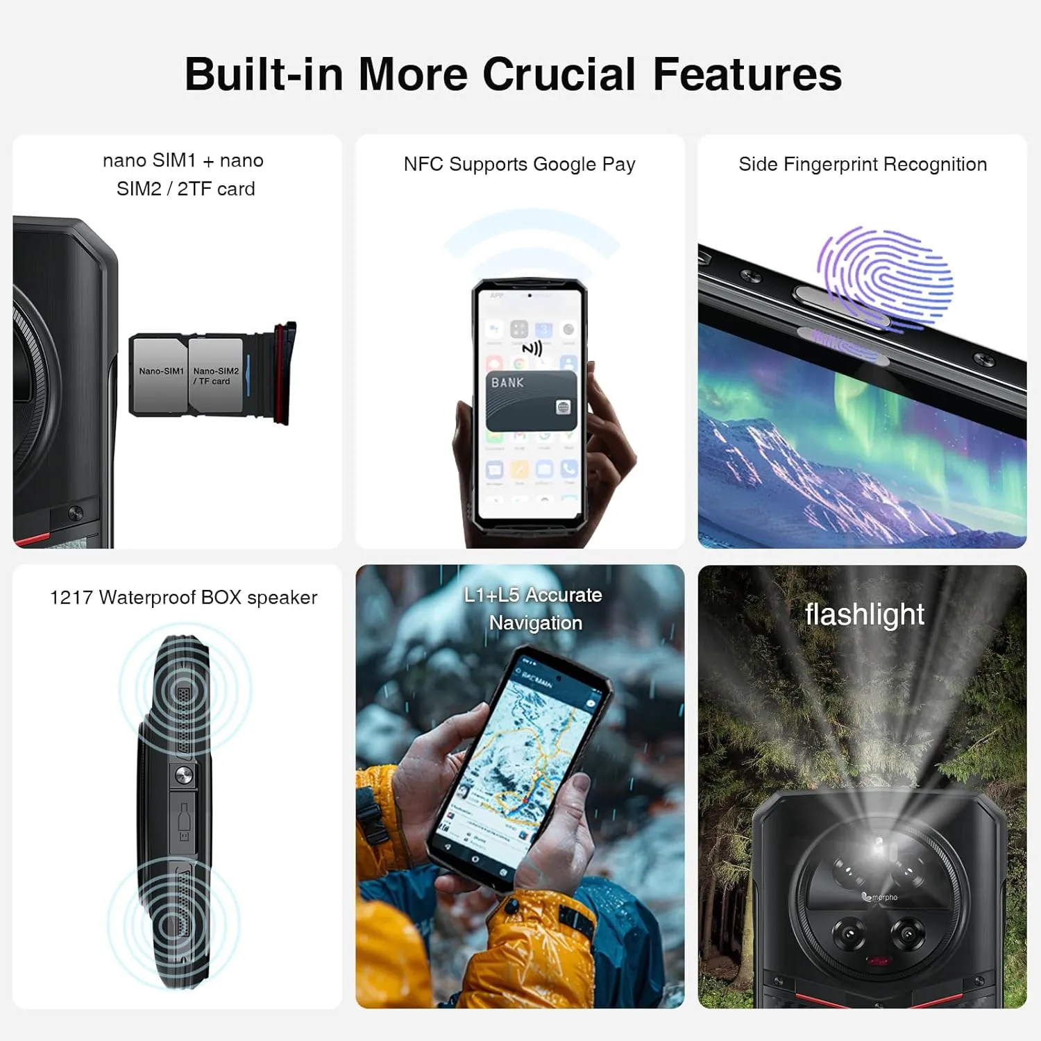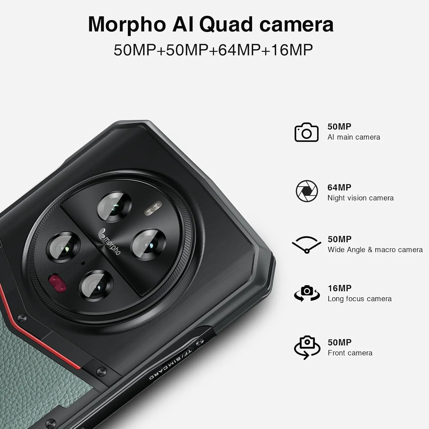 【Morpho Quad Camera+Night Vision】DOOGEE DK10 5g rugged smartphone unlocked Morpho Super Night Mode enables users to capture brighter and clearer shots at night,Morpho EIS Anti-Shake even when photographingin in motion or under vibrating environments,Morpho EIS UltraZoom allows capturing distant objects with clarity and detail,Morpho Panorama GP, Morpho RapidEffect and more!More features for the ultimate photo experience.