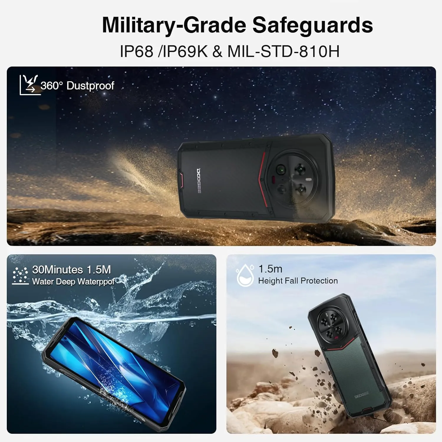 DOOGEE DK10 rugged phone is a fully rugged phone. With its tough exteriors, reinforced components, and MIL-STD-810H certification, it withstands multiple drop tests on all faces, corners, and edges. It achieves IP68 and IP69K levels of protection, guarding against water, humidity, dust, sand, etc.