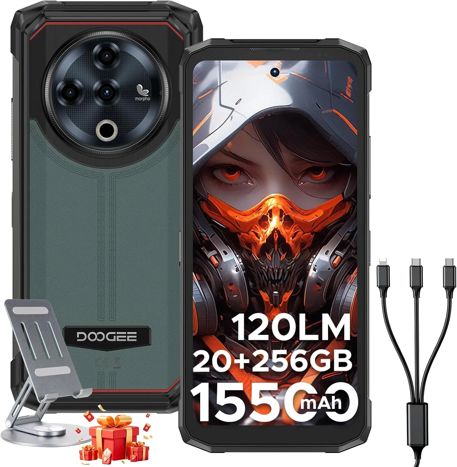 𝟏𝟓𝟓𝟎𝟎𝐦𝐀𝐡 𝐁𝐚𝐭𝐭𝐞𝐫𝐲 & 𝟑𝟑𝐖 𝐅𝐚𝐬𝐭 𝐂𝐡𝐚𝐫𝐠𝐢𝐧𝐠: DOOGEE Fire 6 Power rugged phone is powered by a massive 15500mAh battery, providing up to 1410 hours of standby time to keep you connected all day.This rugged smartphone supports 33W fast charging and 18W reverse charging, with a versatile three-in-one design that allows you to charge three devices simultaneously. (A 3-in-1 charging cable is included as a bonus.) Note: When placing an order, add both the unlocked rugged phone and the stand to your shopping cart and submit the order together