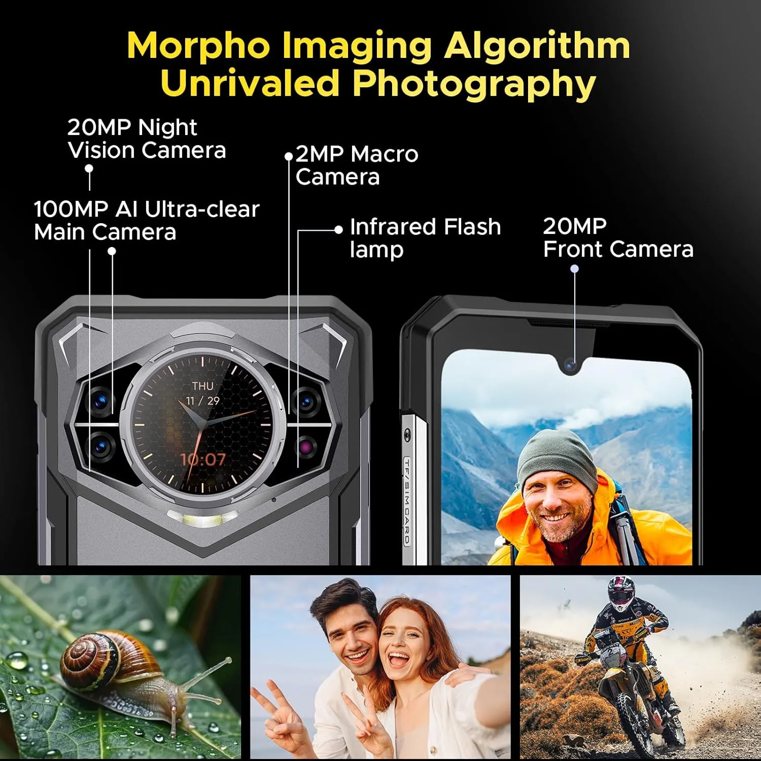 【100MP AI Main Camera +20MPNight Vision+2MP】 DOOGEE 5g rugged smartphone is equipped with a versatile quad-camera setup: a 100MP AI main camera, 20MP night vision camera, 20MP front camera, and 2MP macro camera, offering endless possibilities for capturing moments. The 100MP AI camera delivers crystal-clear details, while advanced AI algorithms provide anti-shake stability. The dedicated night mode enhances low-light photography, making nighttime shots sharper and more vibrant, ensuring a superior photo experience in any setting.