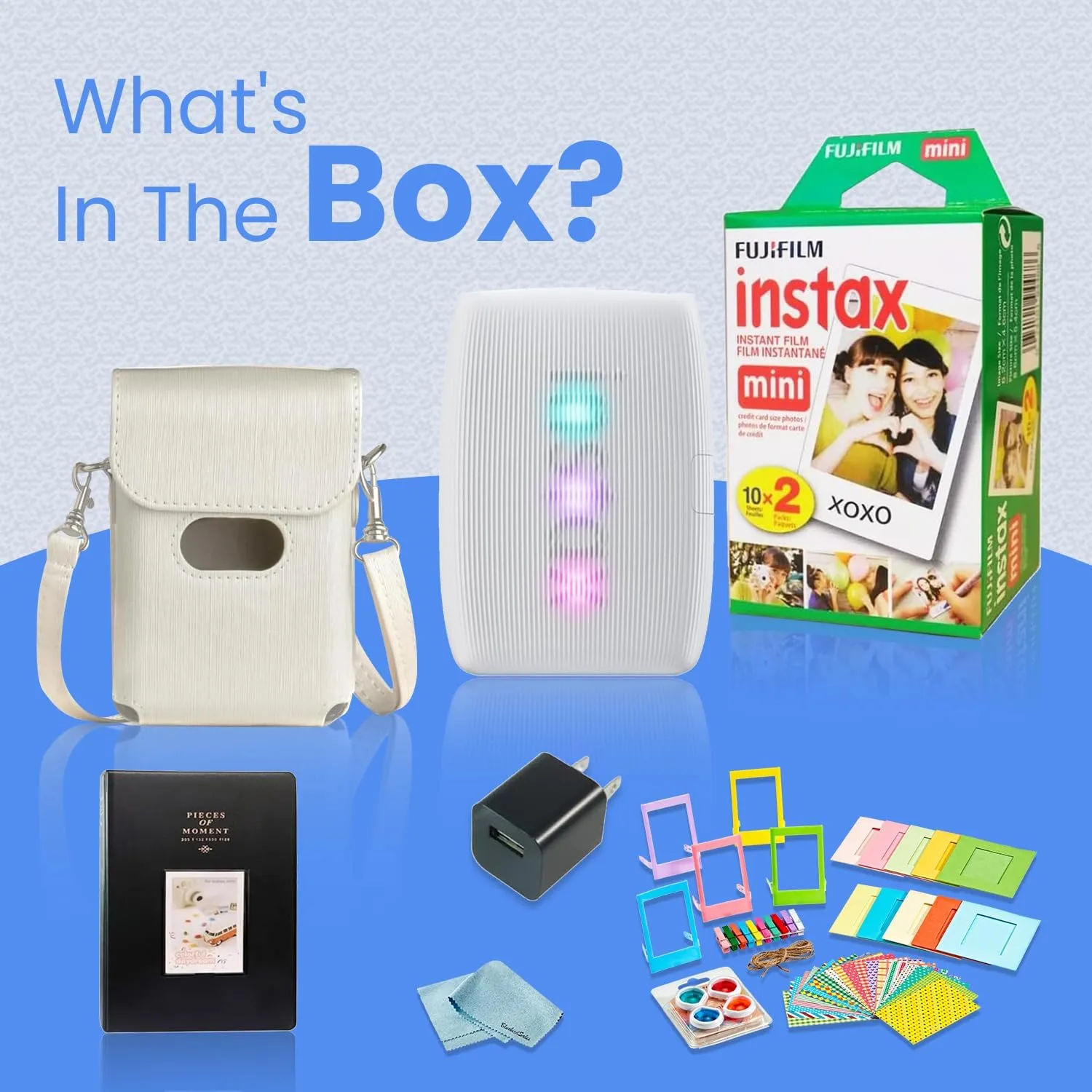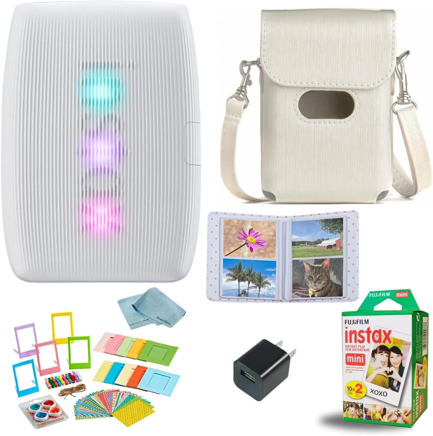 Fujifilm INSTAX Mini Link 3 Smartphone Printer + INSTAX Mini Instant Film (20 Sheets) + USB Wall Charger + BluebirdSales Travel Bag, Photo Album, Microfiber Cleaning Cloth (Clay White)