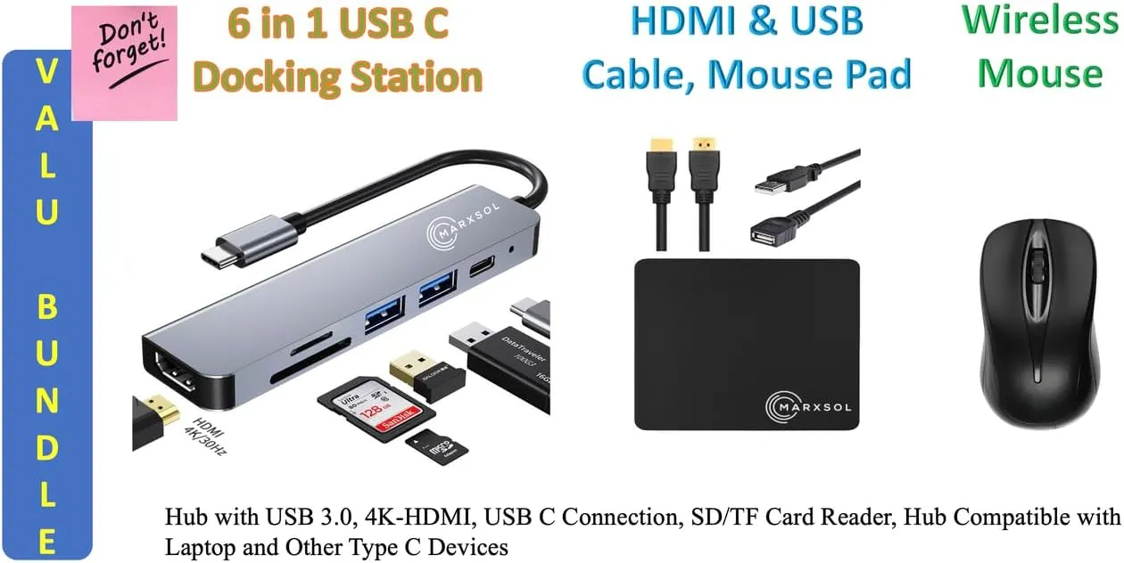 Accessory: MarxsolAccessory (6-in-1 USB-C Docking Station Hub with USB 3.0, 4K-HDMI, USB-C Connection, SD/TF Card Reader + 64GB Memory Card , HDMI & USB Cable, Mouse Pad and Wilress Mouse)