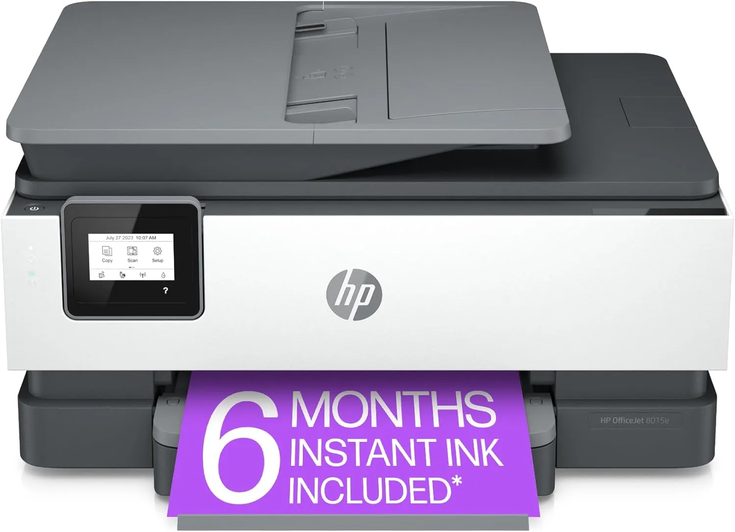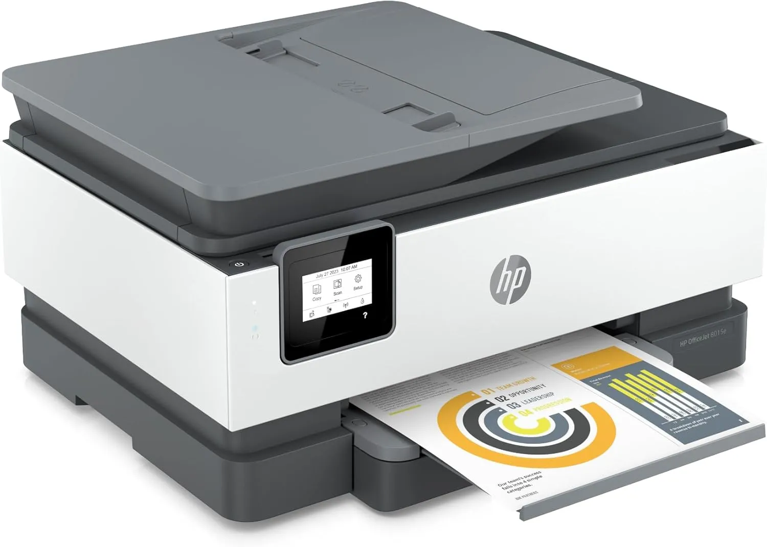 KEY FEATURES – Fast color print, copy and scan, plus 2-sided printing, mobile and wireless printing, and an auto document feeder.. FAST PRINT SPEEDS – Print up to 18 pages per minute in black and 10 pages per minute in color.. WHAT’S IN THE BOX – 228F5A HP OfficeJet 8015e All-in-One Printer, HP 910 Black, Cyan, Magenta, Yellow Ink Cartridges, User Guide, Regulatory flyer, Setup poster, Reference Guide, Power cord.. Safety Data Sheet.