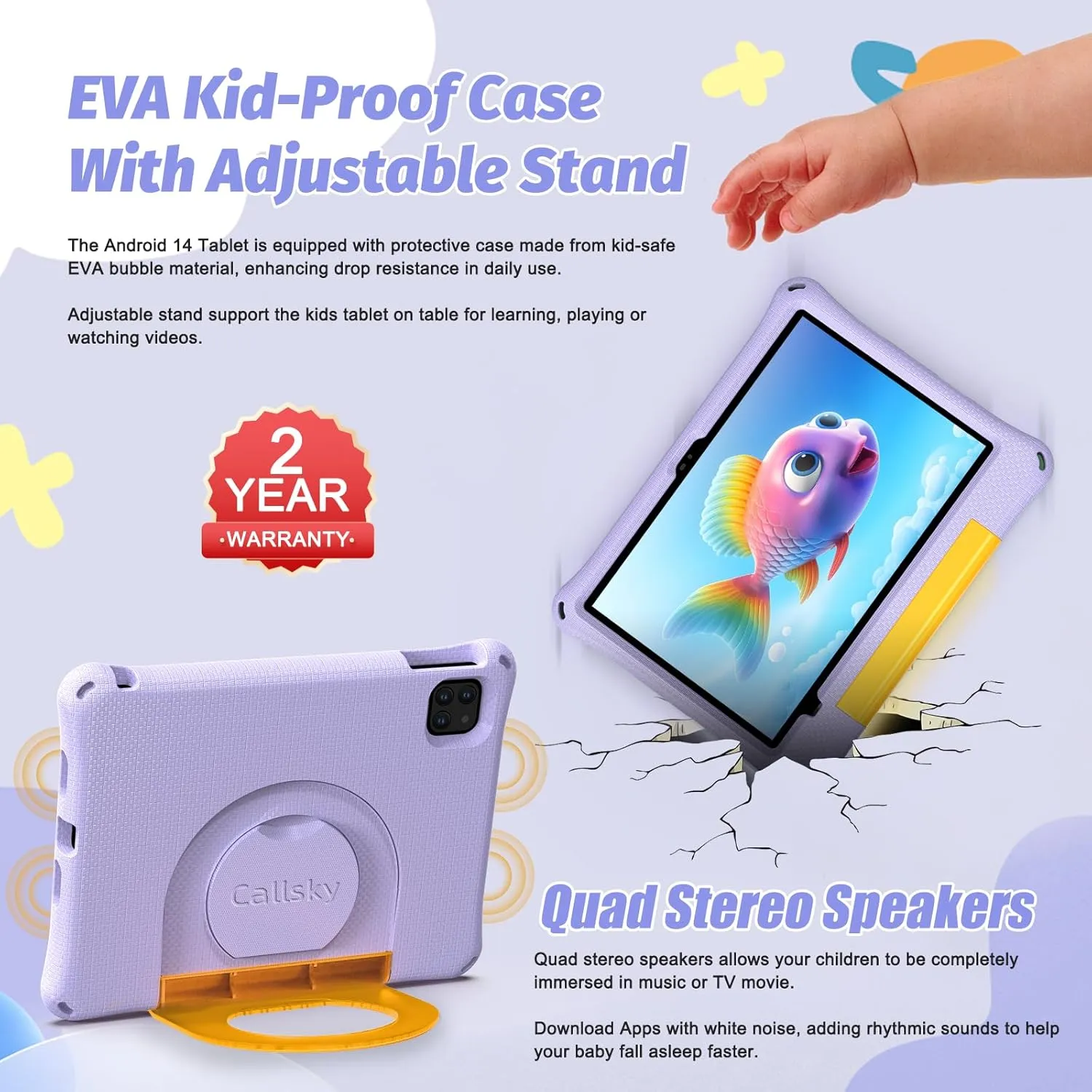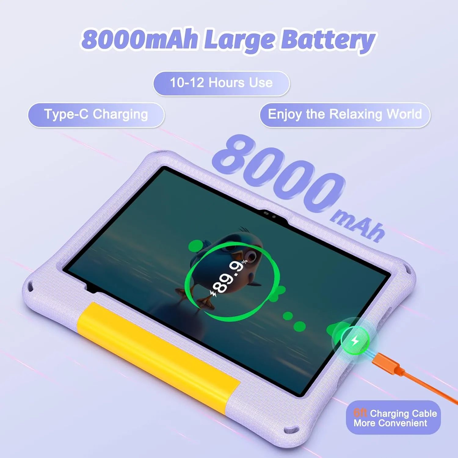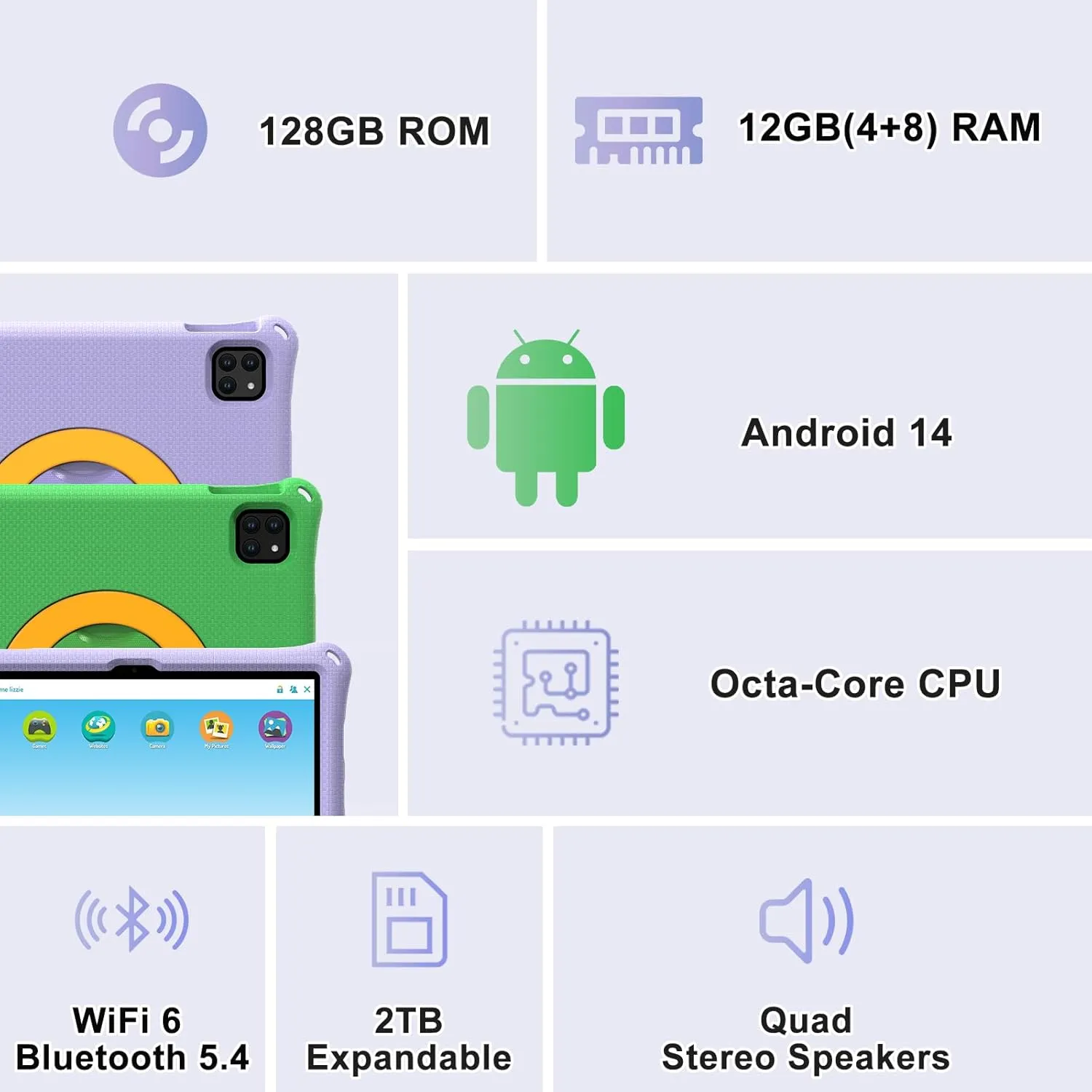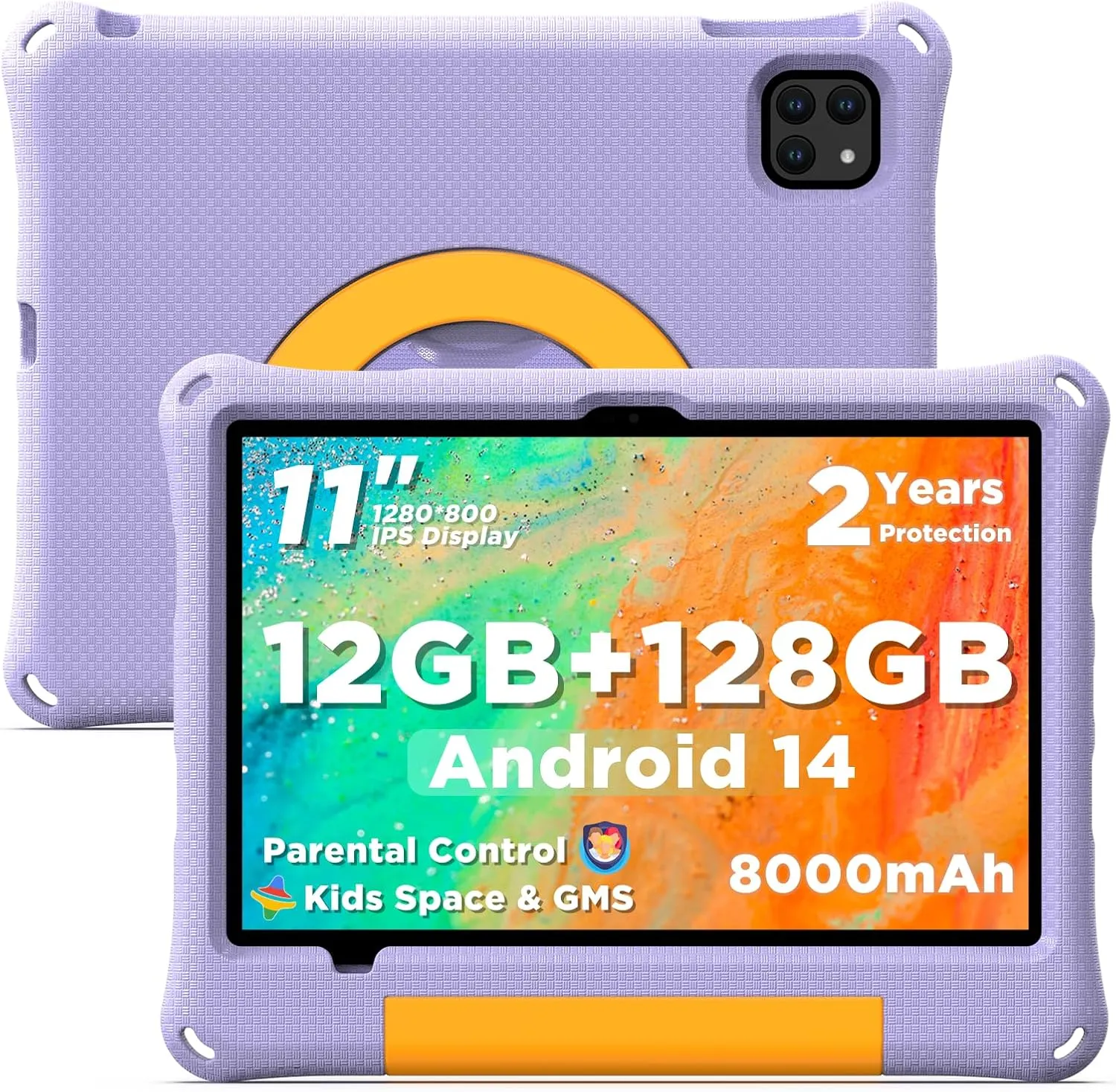 Kids Tablet 11 Inch Android 14, Toddler Tablet 12GB+128GB 2TB Expandable, Octa-Core, 8000mAh, with Drop-Proof Case, Parental Control, WiFi 6, GMS Certified, Bluetooth 5.4, Purple