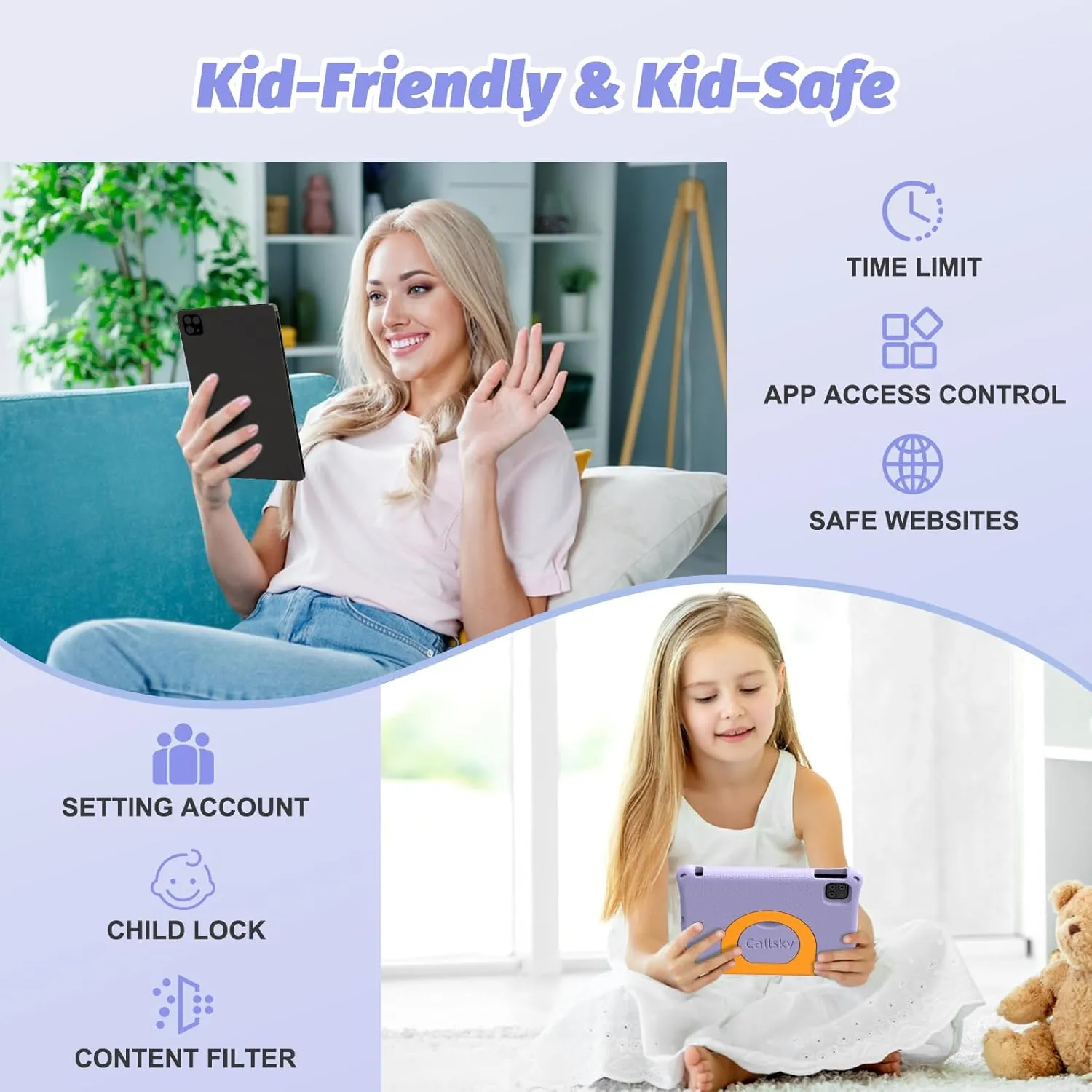 【11 Inch Android 14 Kids Tablet】CALLSKY-NOTE kids tablet is equipped with 10.95 inch 1280×800 IPS display, octa-core processor, 12GB(4+8) RAM and 128GB storage (expandable to 2TB via Micro SD card), plus WiFi 6 and Bluetooth 5.4 connectivity, 2MP+5MP Dual Camera, meeting all learning and entertainment needs. The 11 inch kids tablet runs on Android 14 system, featuring a user-friendly interface and easy-to-use operations