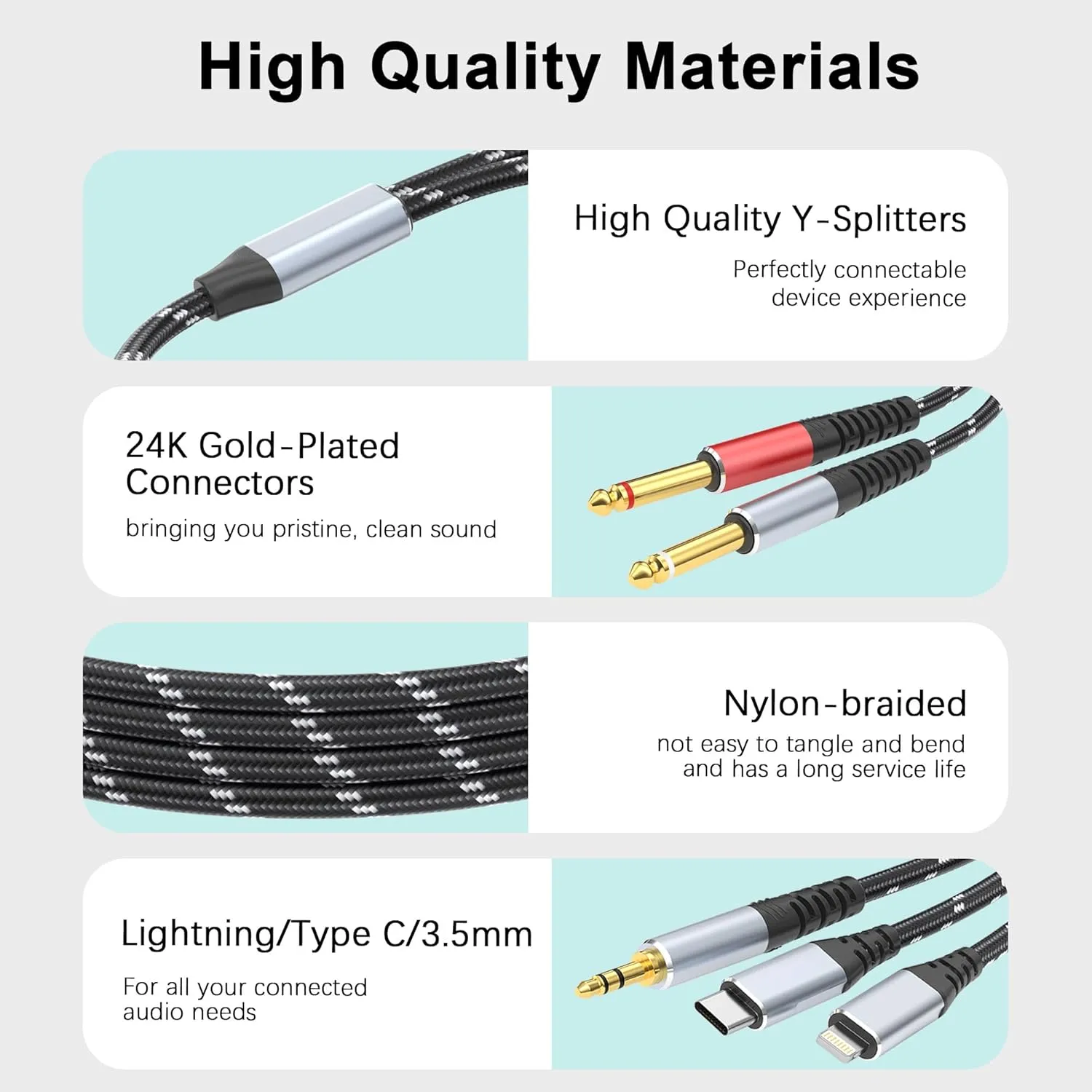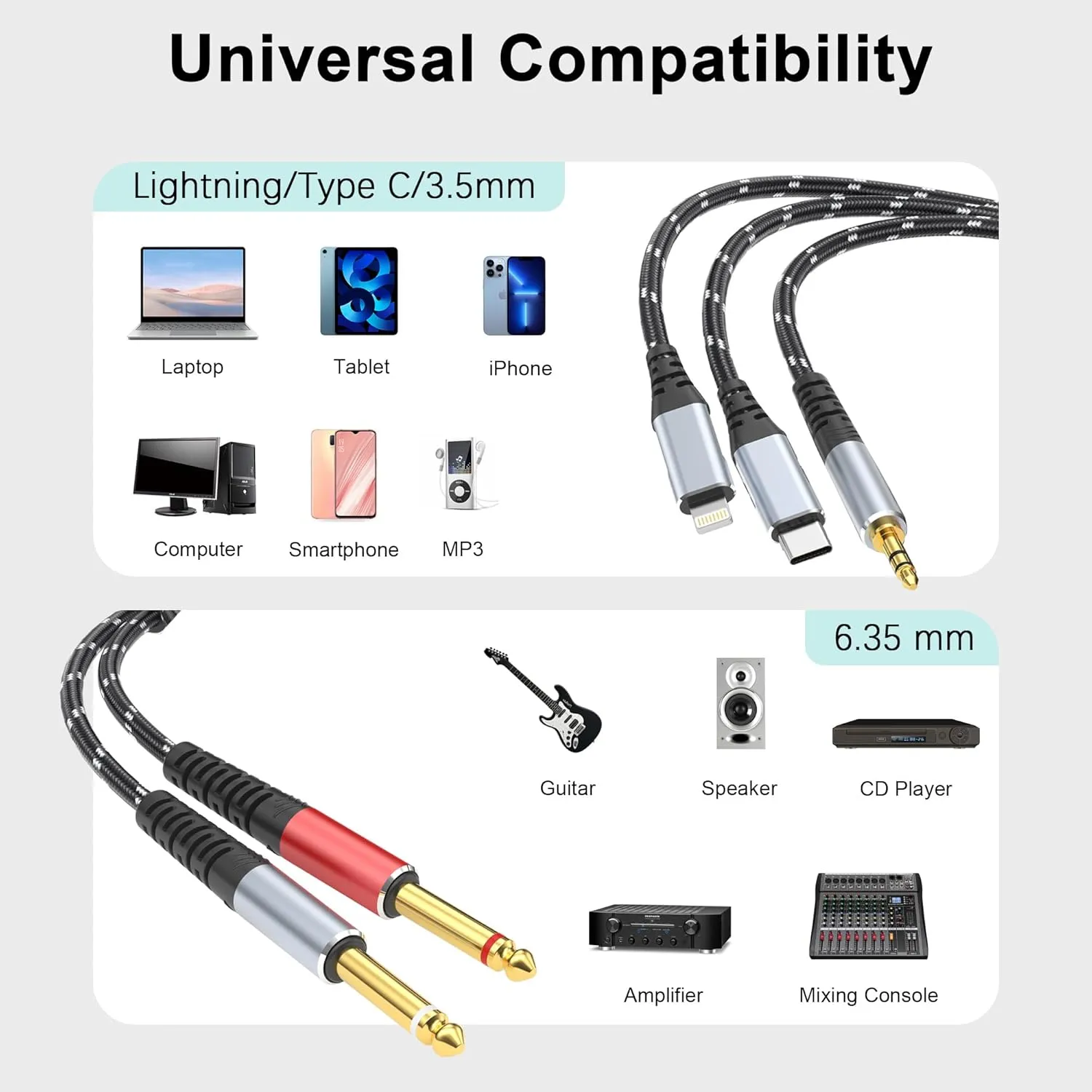 WIDE COMPATIBILITY: This 3.3FT Lightning type c DC 3.5mm 1/8″ to Dual 6.35mm 1/4″ Male Audio Auxiliary Cable is compatible with iPhone/iPad Pro 2020 and more USB C devices, suitable for all kinds of audio signaling and interconnections between appliances.