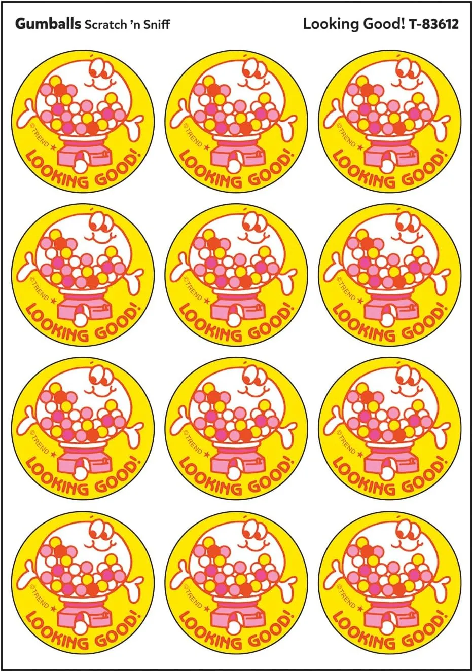 Get a whiff of this Looking Good!, gumballs-scented sticker! TREND Scratch ‘n Sniff Stinky Stickers from the ’80s are BACK! Fun to collect, trade, and celebrate accomplishments and special occasions. Collectors will be happy to spot the star symbol to distinguish TREND Retro Stinky Stickers from those printed in the 1980s. Each pack includes 24 stickers on 2 sheets.