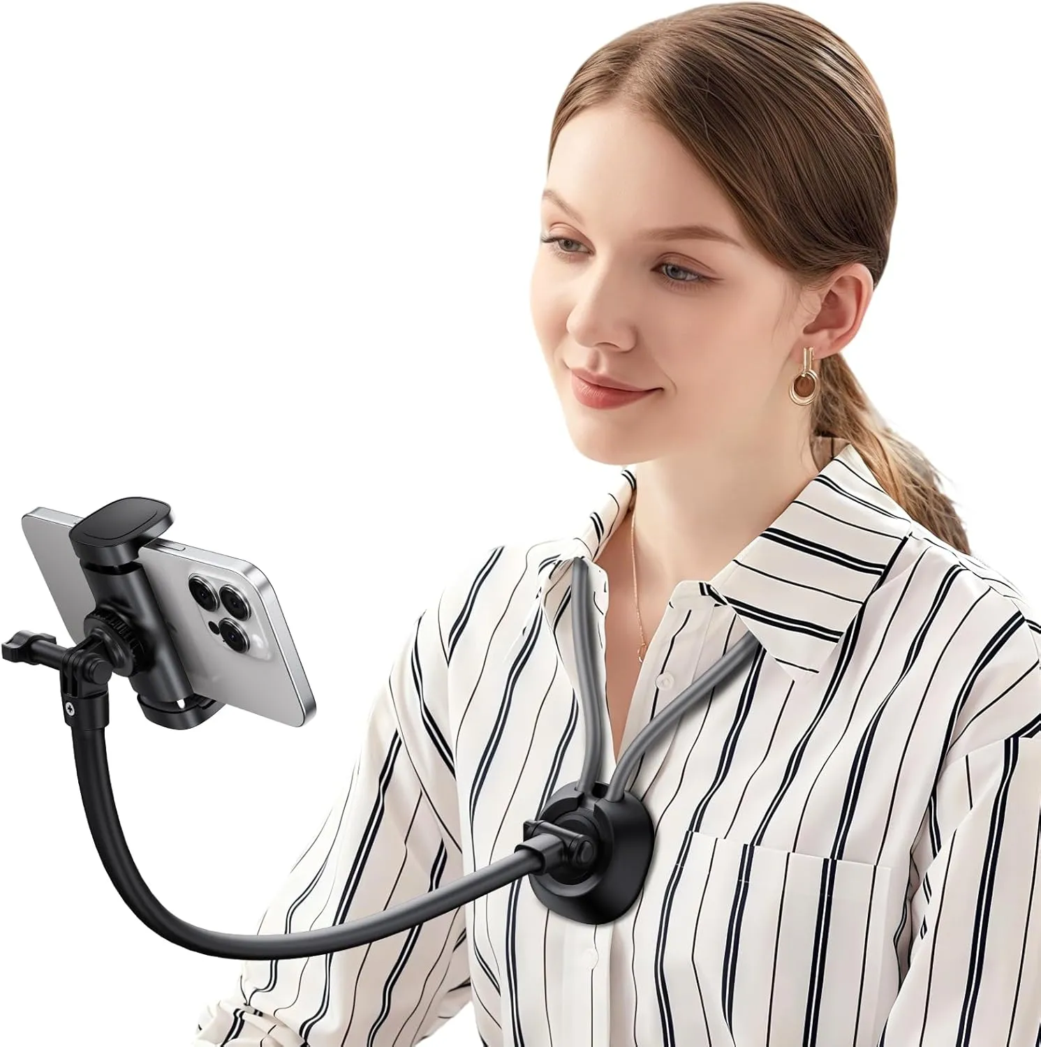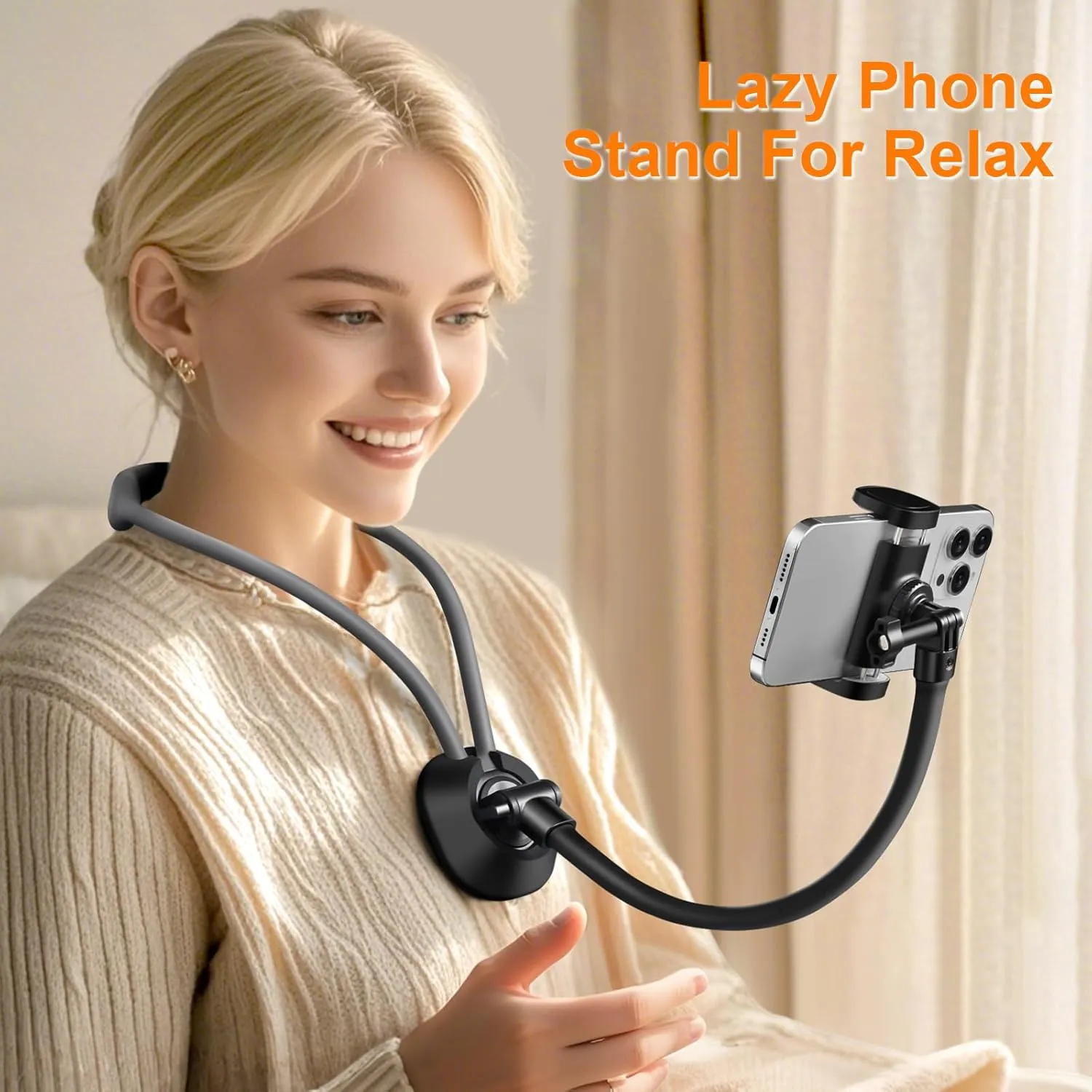 Durable and Skin-friendly Material: Bend and fold the neck phone holder as you like, comfortable to wear the neck tripod mount for a long time; The neck mount phone holder is skin-friendly and lightweight; Flexible and not tired of the neck, skin-friendly protective layer, safe and odourless, built-in metal stainless steel gooseneck tube; Feel free to bend the phone stand holder, soft and rigid, well shaped and not easy to break