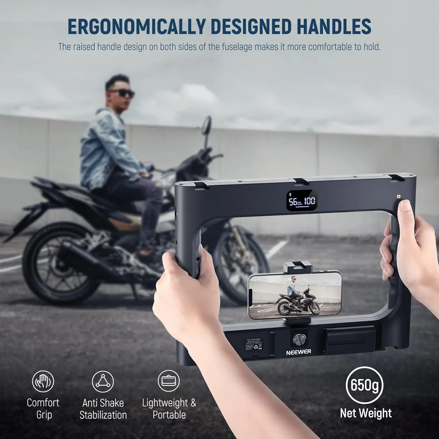 【Bluetooth Wireless Shutter】 Enable Bluetooth on your smartphone and discover “NEEWER Shutter” in the device list. Select and connect the device, then you can use the video rig’s control button to take pictures, selfies, record videos, and adjust the phone volume. Note: This function is only available for smartphones. Comes with a standard phone holder compatible with iPhone 16 15 14 pro max 13 Mini, Samsung Galaxy S24 S23 S22 Ultra and other Android phones within the size range