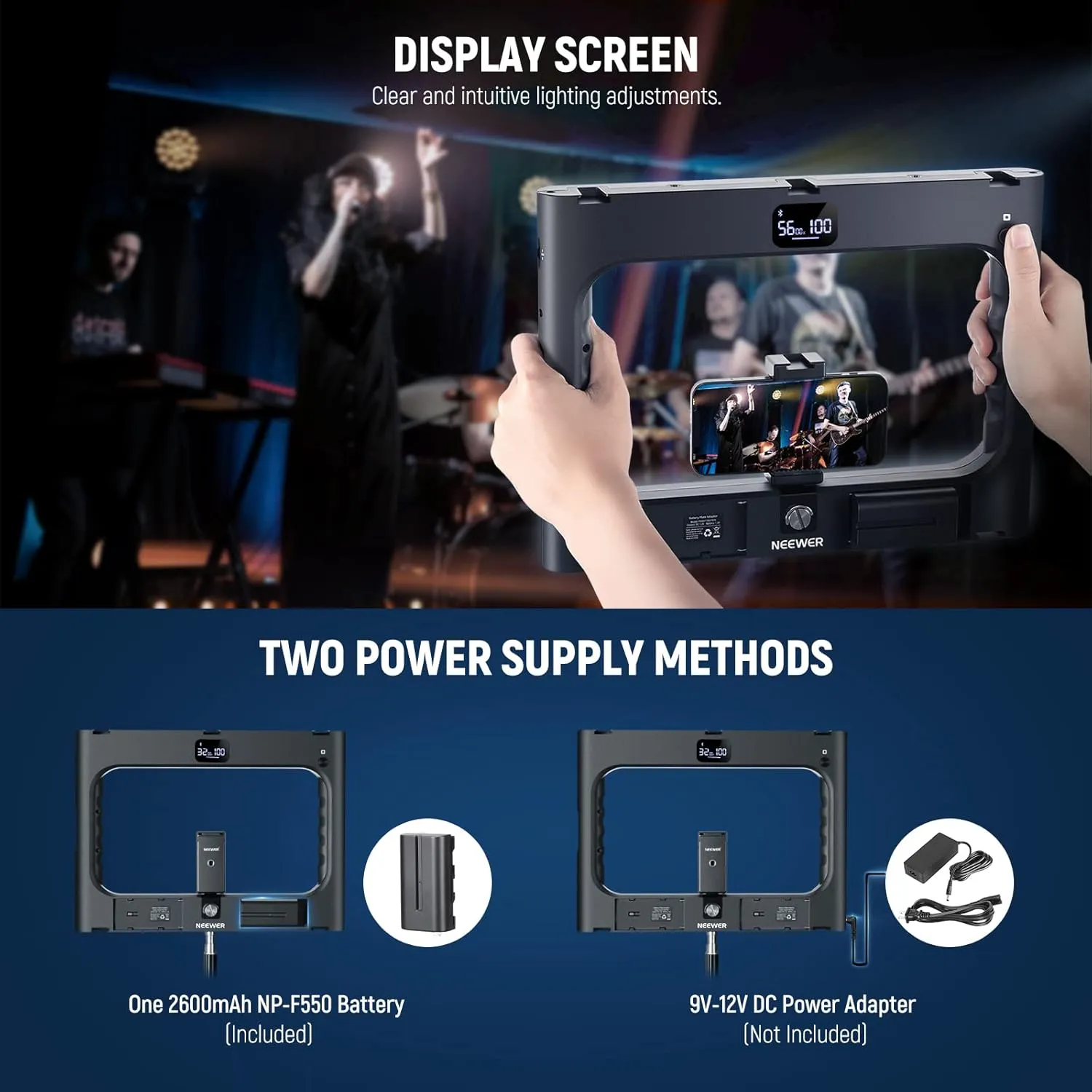 【Handheld Rig with LCD Panel】 Measuring 13.2″ x 9.8″ x 1.4″ (336 x 248 x 35mm) and weighing 23.6oz (670g), the rig is lightweight and easy to carry from one place to another. The dual side handles are ergonomically designed to provide you with a comfortable and firm handheld shooting grip, and the LCD panel displays the settings for precise lighting adjustment