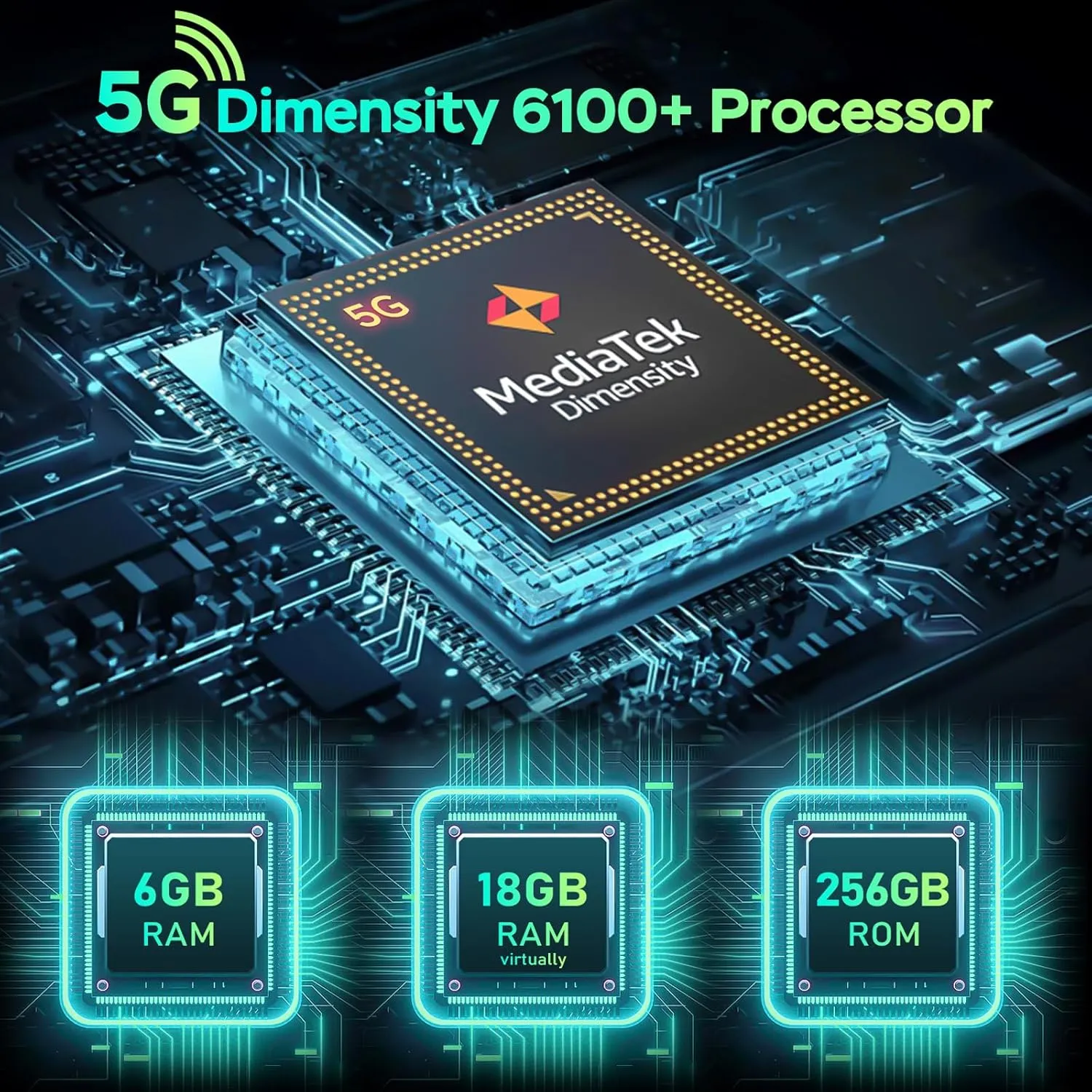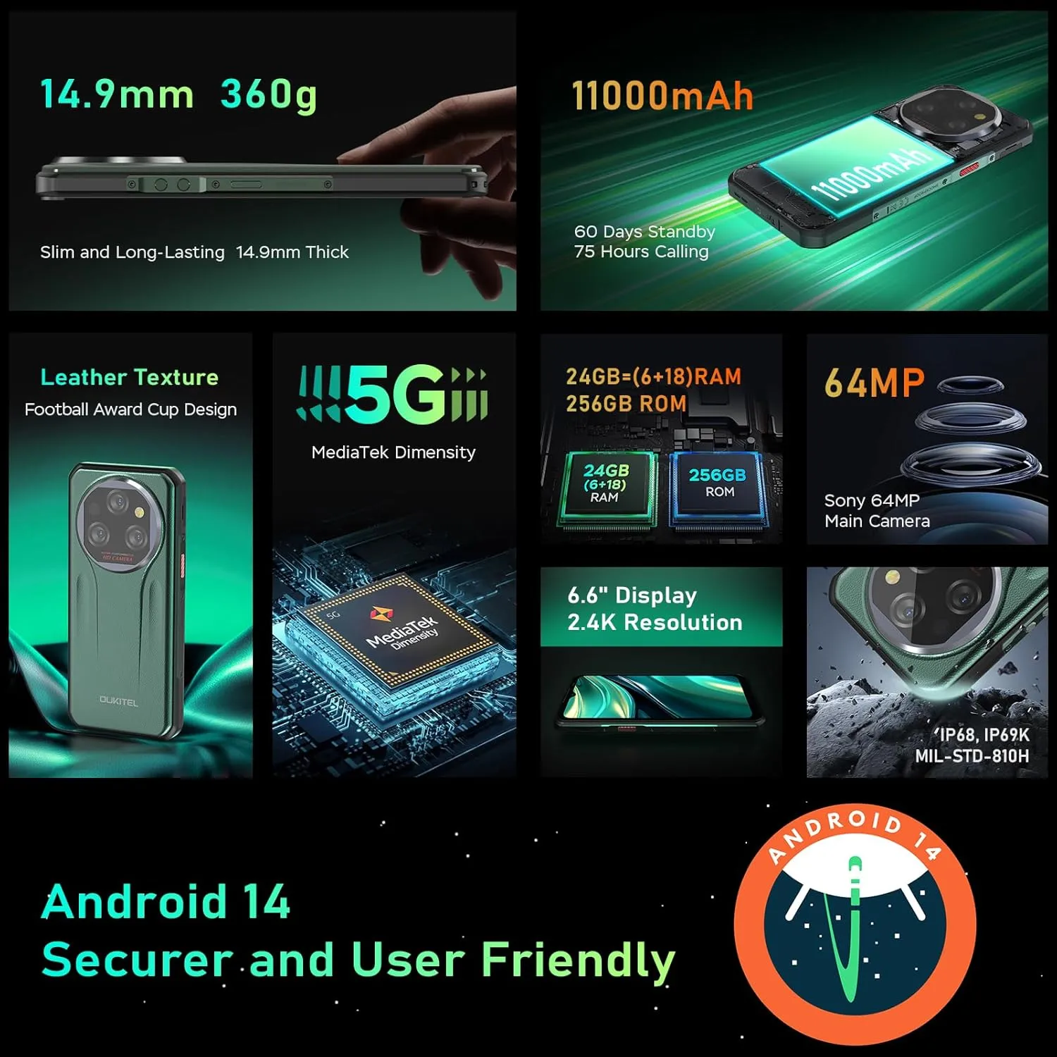 (Not Support AT&T/Verizon) 5G MediaTek Dimensity 6100+Processor & 256GB Storage : OUKITEL WP39 rugged phone is equipped with a powerful 5G CPU – the MediaTek Dimensity 6100+ processor, which improves power efficiency. Using UltraSave 3.0+ technology, combined with the mobile phone’s large 11000mAh battery, it has lower power consumption and longer battery life. Power consumption is reduced by 25% and battery life is increased by 18%. Say goodbye to delays, crashes, or that uncomfortable overheating feeling in your hand. The OUKITEL WP39 packs 24GB of RAM (6GB+18GB virtual RAM) and 256GB ROM of internal storage. Provides you with ample storage space for all your apps, media, and files.