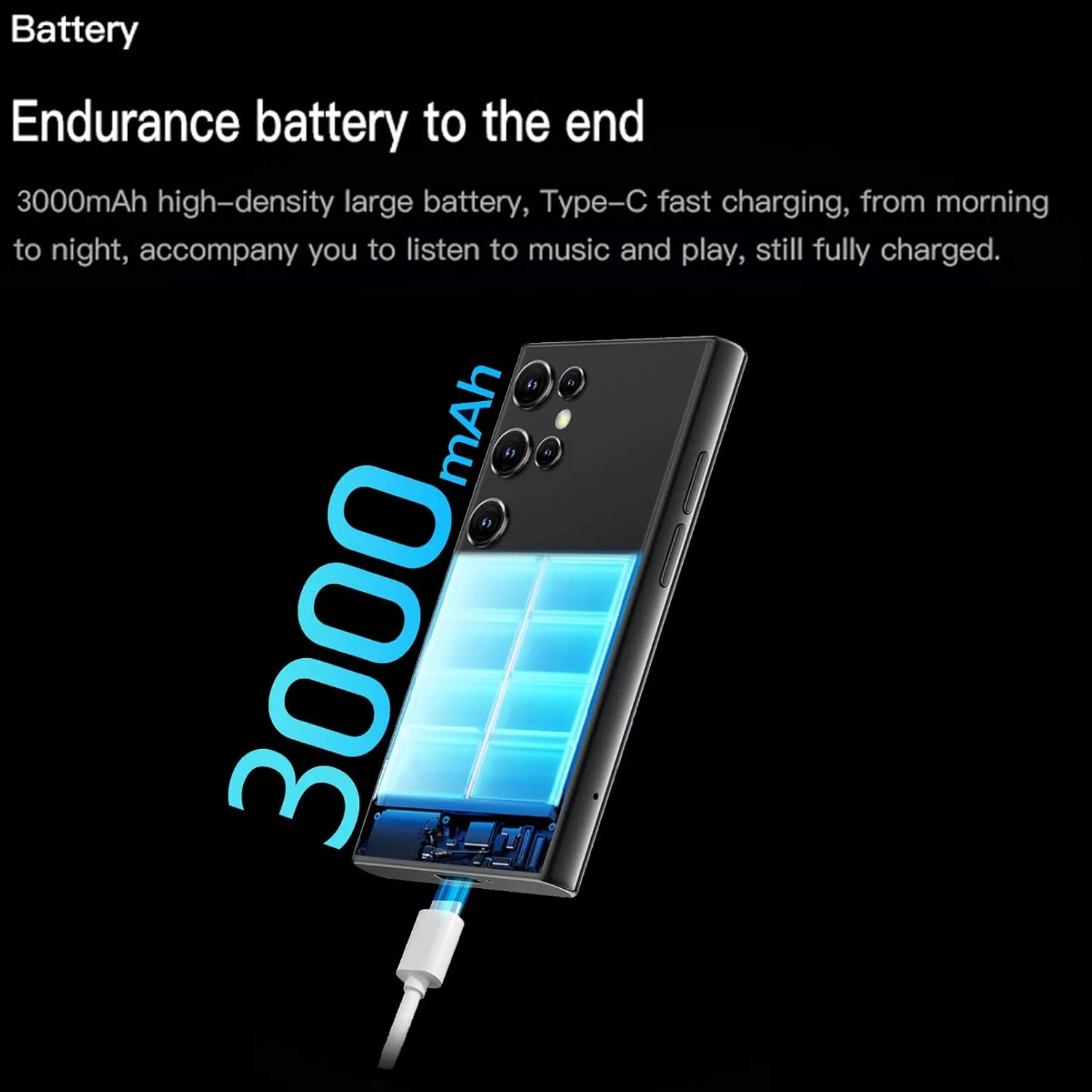 Large Capacity Battery: 3000 mAh Battery; Dual Camera: front 2 Mp, back 5Mp. Dual Sim dual standby. Other functions: calculator, alarm clock, calendar, memo