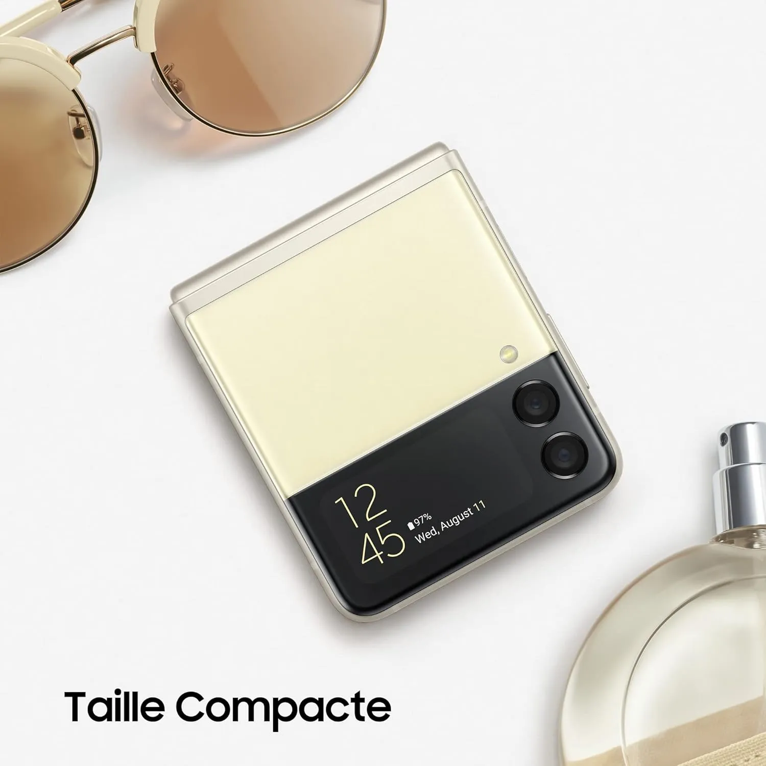 Generate a 100-character excerpt from the product description below. Return ONLY the excerpt text, without any prefixes, notes, or explanations. Example: “Compact wireless speaker with 12-hour battery life and waterproof design.” Product description: FLEX YOUR BEST ANGLE: With Flex Mode, just unfold your mobile phone’s screen to your best angle for hands-free pics and video calls; Choose what you want to capture, set it down, stand back and shoot your best shot. A CAMERA THAT GOES STEADY: Thanks to Samsung Galaxy Z Flip3’s Super Steady feature, you can just set it down and strike a pose for picture-perfect selfies. ULTRA COMPACT, ULTRA COOL: Show off your style game without the tradeoffs; With a compact design that unfolds, you don’t have to compromise screen size for your favorite outfit. FAST CHARGING FOR FAST LIVING: Galaxy Z Flip3 smartphone charges fast so that all your moments last; There’s a right time for downtime and a low battery signal, isn’t it. ALL YOUR NOTIFICATIONS, FRONT AND CENTER: Control your cellphone, even when it’s folded shut; Galaxy Z Flip3 notifies you on the external cover screen, so you can view notifications and check the weather. ONE SCREEN, TWO APPS: Launch two apps simultaneously, so you can take selfies while browsing Gallery, watch movies while texting friends, and shop multiple stores at once, on the go. 6.7″ Foldable Dynamic AMOLED 2X, 120Hz, HDR10+, 1080×2640 pixels, Cover Display: 1.9″ Super AMOLED, 260×512 pixels, Android 14 128GB ROM, 8GB RAM, Qualcomm SM8350 Snapdragon 888 5G (5 nm), Octa-core, Adreno 660, 3300mAh Battery Rear Camera: 12MP, f/1.8 (wide) + 12MP, f/2.2 (ultrawide), Front Camera: 10 MP, f/2.4 (wide) CDMA 800/1900 / TD-SCDMA, 3G: HSDPA 850/900/1700(AWS)/1900/2100, CDMA2000 1xEV-DO, 4G: LTE 1/2/3/4/5/7/8/12/13/14/18/19/20/25/26/28/30/38/39/40/41/46/48/66/71, 5G: 2/5/25/41/66/71/260/261 SA/NSA/Sub6/mmWave Discontinued US Model, is no longer covered by Manufacturer’s Warranty. Fully Unlocked and compatible with Most GSM and CDMA Carriers like AT&T, T-Mobile, AT&T, MetroPCS, etc. Will Also work with CDMA Carriers Such as Verizon, Sprint.