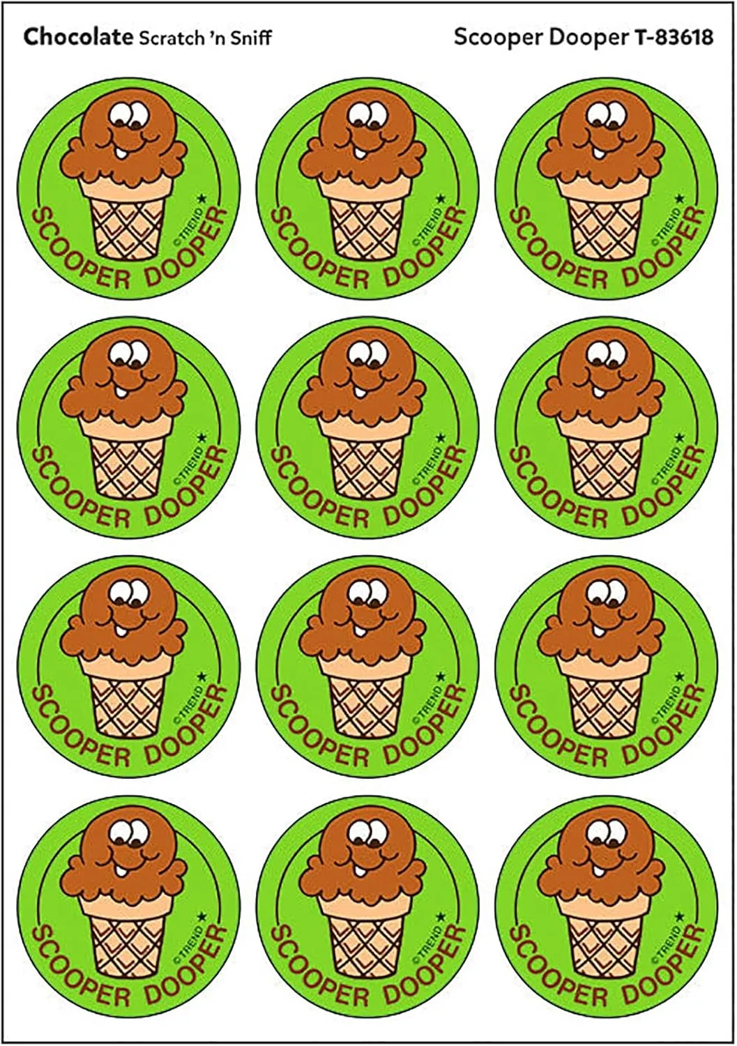Get a whiff of this Scooper Dooper, chocolate-scented sticker! TREND Scratch ‘n Sniff Stinky Stickers from the ’80s are BACK! Fun to collect, trade, and celebrate accomplishments and special occasions. Collectors will be happy to spot the star symbol to distinguish TREND Retro Stinky Stickers from those printed in the 1980s. Each pack includes 24 stickers on 2 sheets.