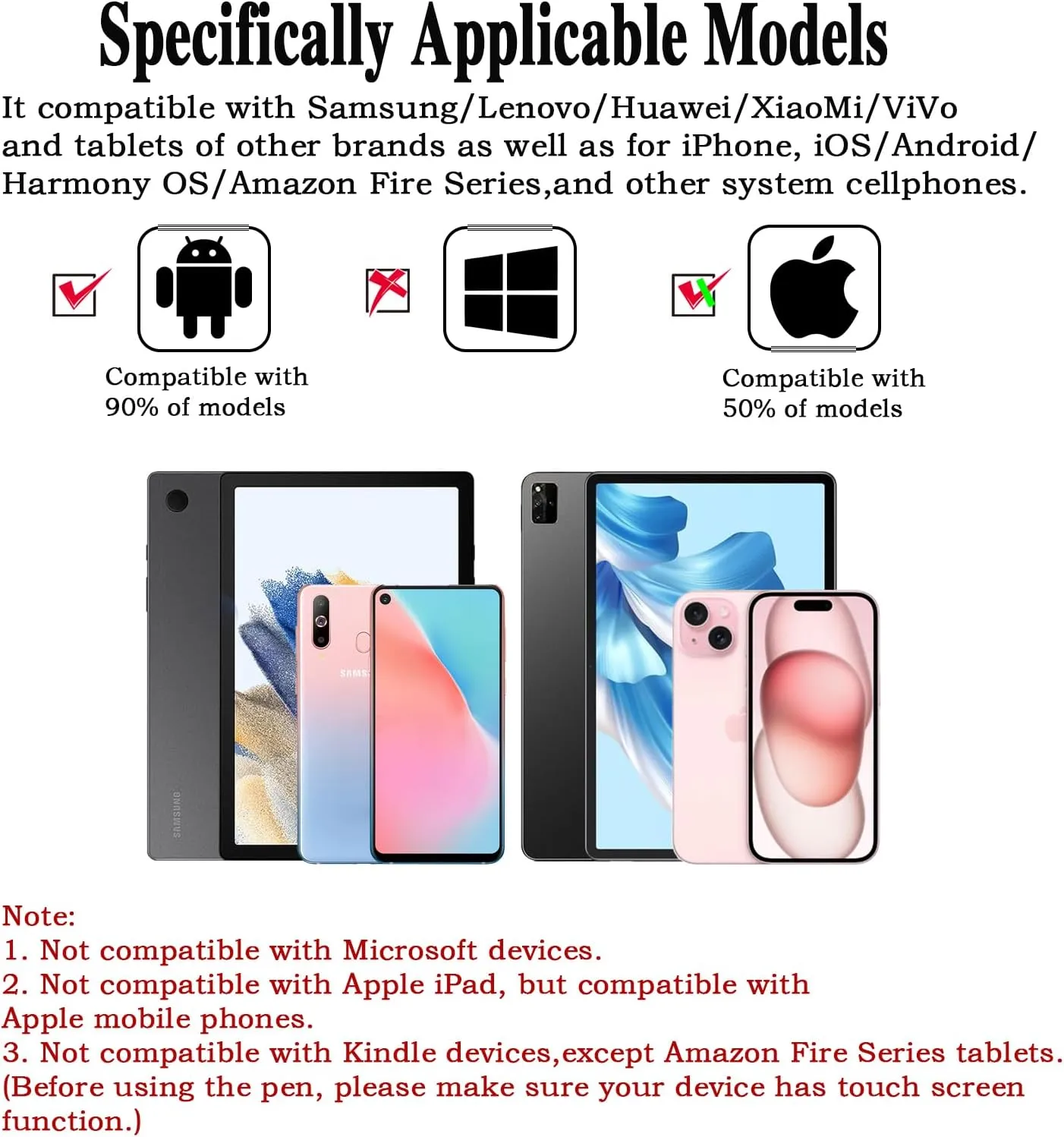 【Compatibility】: Please note that our iphone stylus does not have the function of preventing accidental touches with the palm of your hand. Please do not put your hand on the screen when using it. This fine point stylus pen for touchscreen is compatible for iOS/Android touchscreens, suitable for Samsung/Lenovo/Huawei/XiaoMi/ViVo and tablets of other brands as well as for iPhone, iOS/Android/Harmony OS/Amazon Fire Series,and other system cellphones. (Note: This stylist pens not compatible for iPad & Microsoft tablets and windows systems)