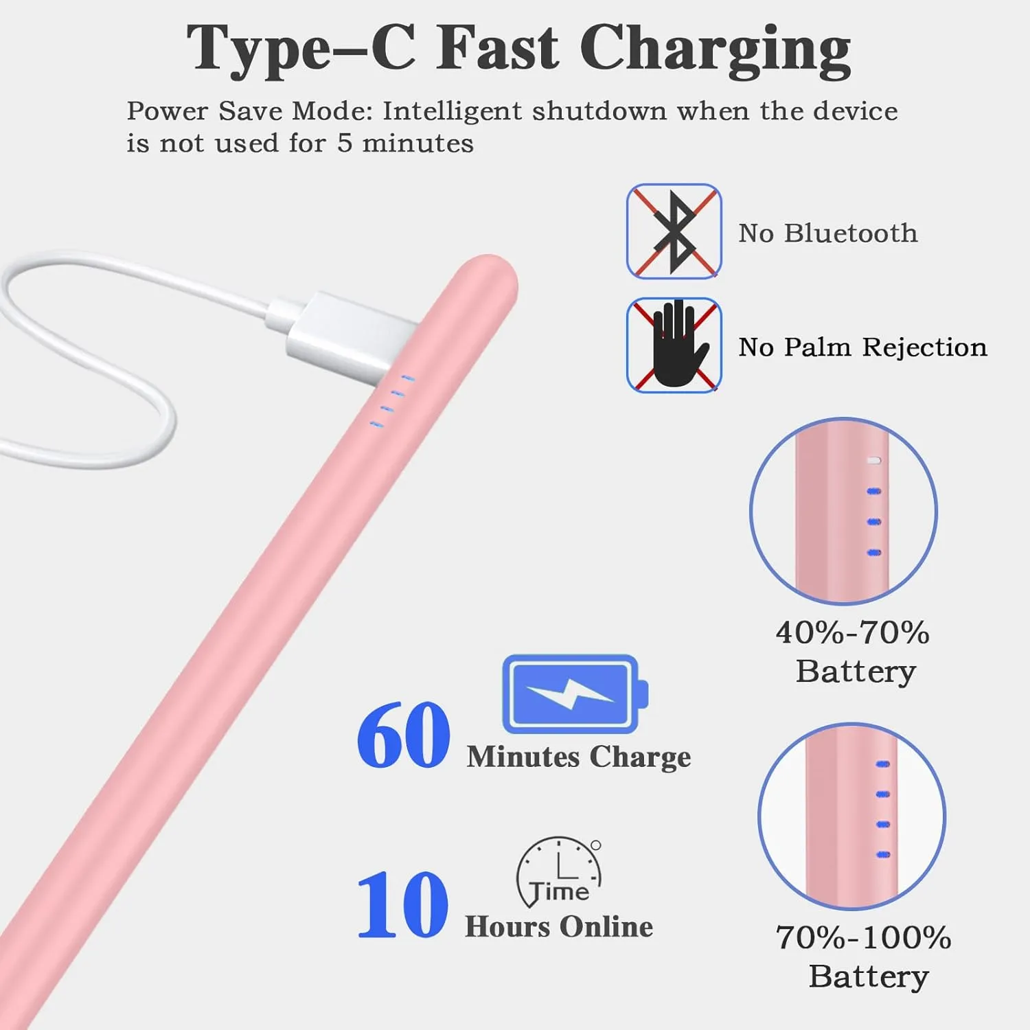 【Type-C Charging and Indicator Light】: Our android pen for tablet for cell phone has a standard Type-C charging port and four indicator lights, so you can check the battery level and charge it at any time. This iphone pencil stylus can be fully charged in just 60 minutes and can be used continuously for more than 10 hours. Don’t need to turn off it by hand, the fire tablet pen will auto-fall asleep after idle for 5 minutes to save power