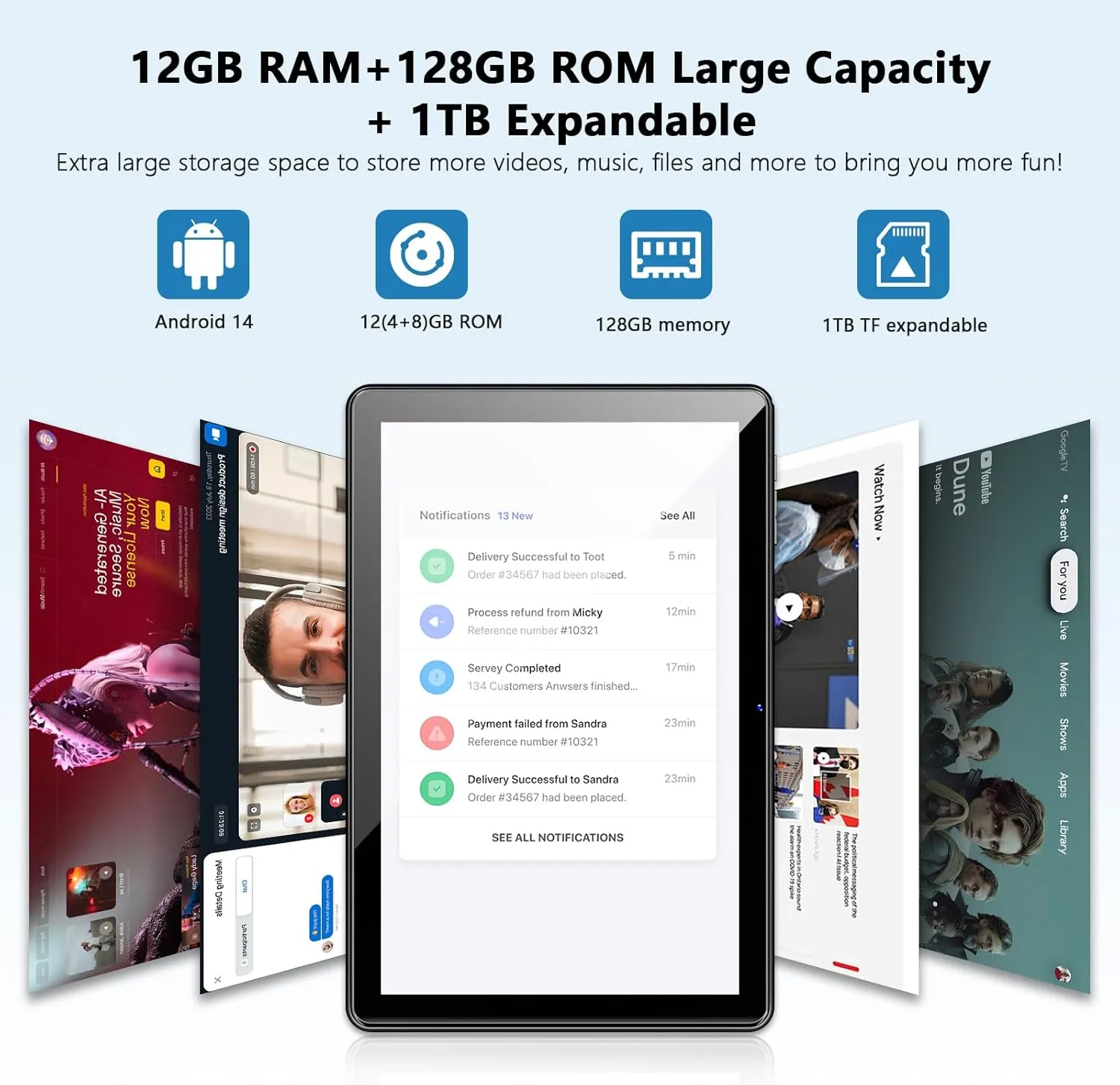 [Smooth and fluid experience] With the latest high-performance processor and 12GB RAM + 128GB ROM, this tablet is able to handle multiple apps with ease, maintaining a smooth experience whether you’re editing documents, browsing the web, or running games all at the same time.Android 14 further optimises background management to ensure that every app responds quickly.