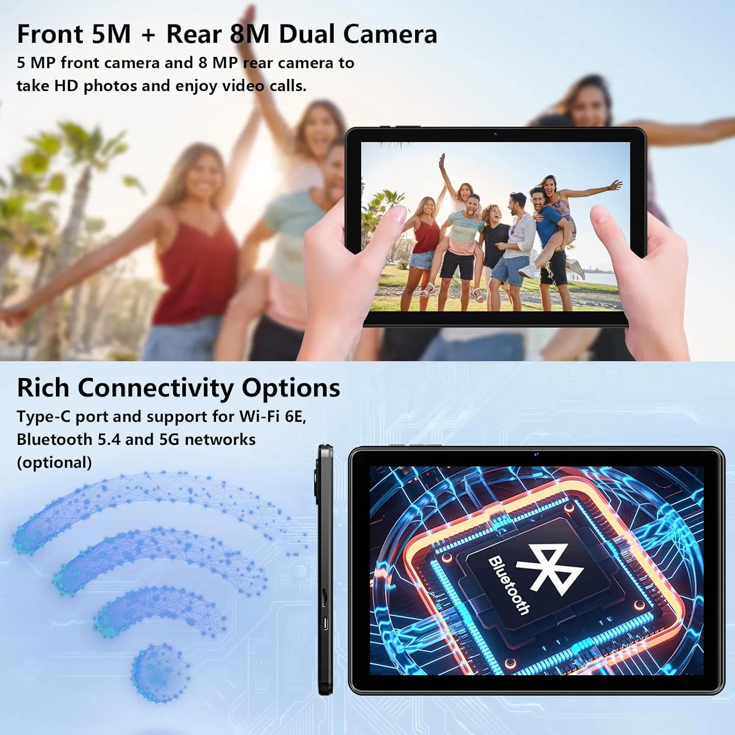 [Wi-Fi 6 + Bluetooth 5.4] Featuring 6th generation Wi-Fi technology, this Android tablet supports 5G and 2.4G dual-band Wi-Fi, searching for networks quickly and freely to provide a better internet connection with low latency, strong signal and fast speed. It also comes with a clear 5MP front camera and 8MP rear camera for your daily needs, providing you with great photos and clear video chats.