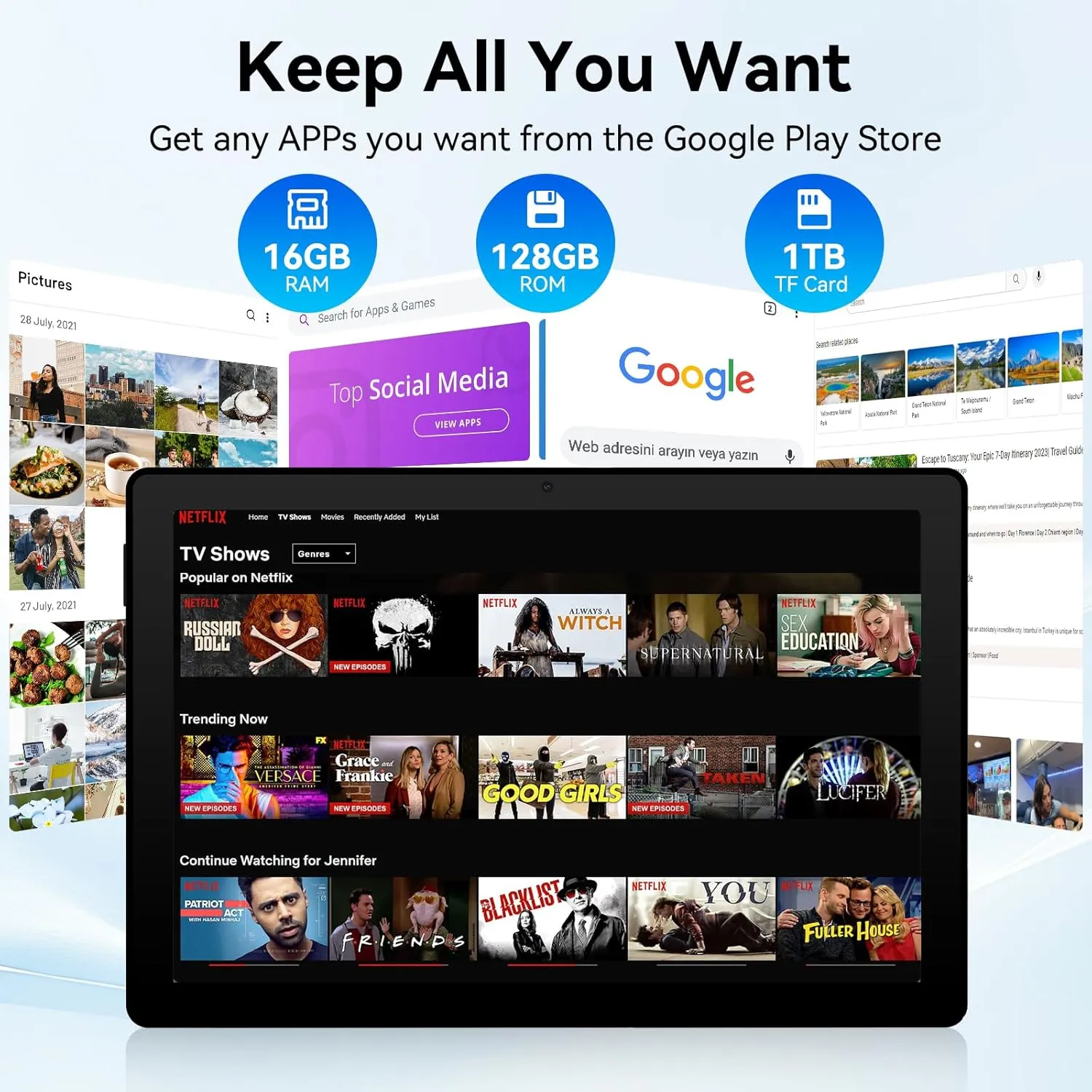 ๐๐ฑ๐ฒ๐พ๐๐ฎ๐๐ฒ ๐ ๐ฒ๐บ๐ผ๐ฟ๐ ๏ผ ๐ช๐ถ๐ฑ๐ฒ๐๐ถ๐ป๐ฒ๐๐ญ: Experience unparalleled speed and storage with 16GB RAM (4GB Physical+ 12GB Virtual) and 128GB ROM. UGRIHACH tablet is GMS certificated, you can download any needed APPS from Play Store. Expand up to 1TB via TF card (not included) to keep all your favorite apps, photos, and files right at your fingertips. The Android tablets are WidevineL1 certified, you can stream HD content on platforms like Netflix and Amazon Prime Video, and enjoy crystal clear videos on the go