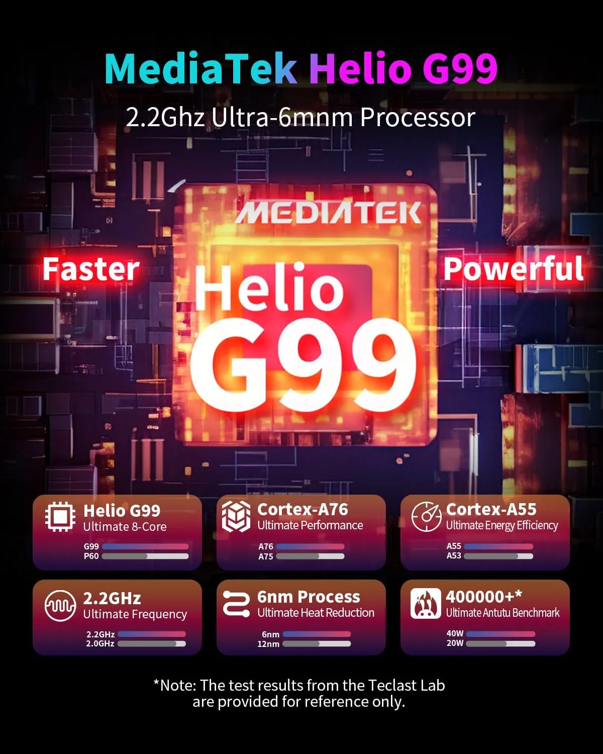 【Helio G99 CPU + 10000mAh Battery】The TECLAST T65Max Android tablet features the powerful MediaTek Helio G99 chip, offering fast and energy-efficient performance, perfect for gaming on its 13 inch screen. Its 10000mAh battery ensures up to 10 hours of uninterrupted use, whether watching movies or listening to music. Plus, the 18W fast charging feature saves you time by quickly recharging your tablet