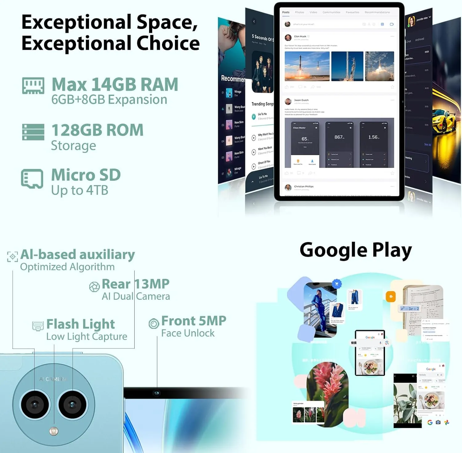 【8000mAh + AI camera 13MP / 5MP】 Tablet built-in 8000mAh battery, which is large capacity than other tablet, will last you all day. Equipped with USB Type-C + independent 3.5mm headphone jack to meet various needs. The Android 14 tablet P50 is equipped with 13MP + 5MP, which allows you to freely shoot 13 modes such as people, sports, snow, night, and rain