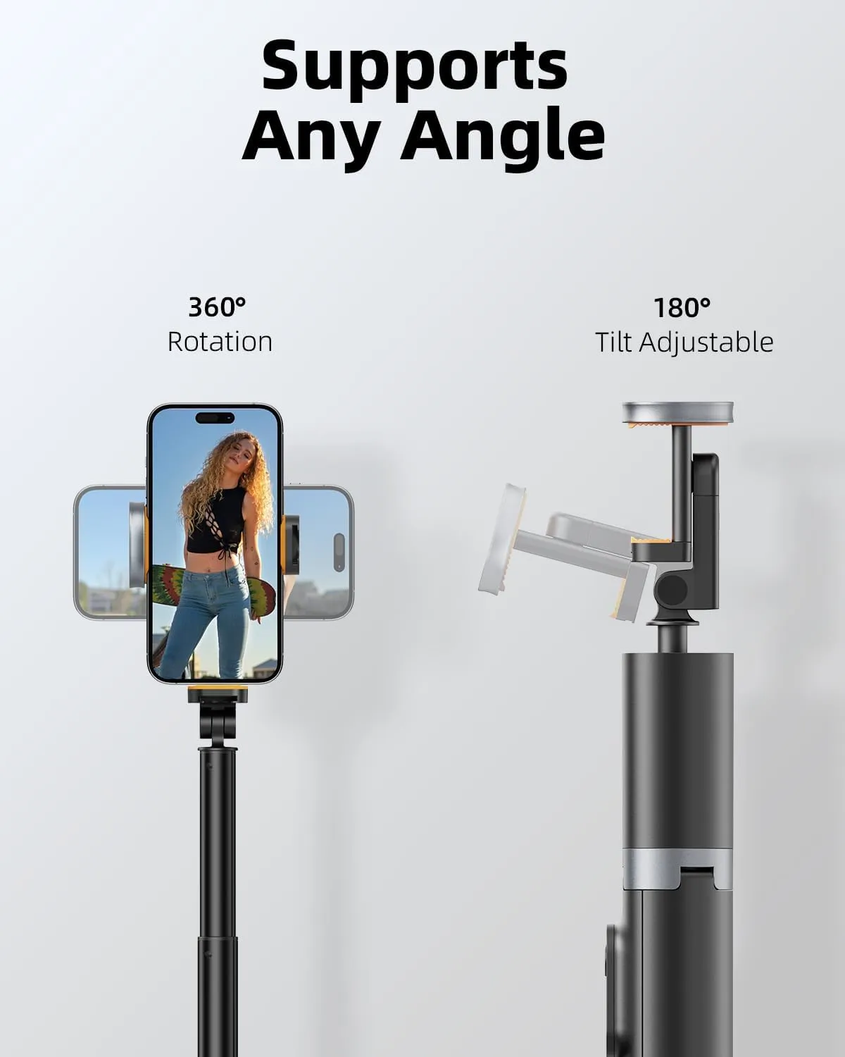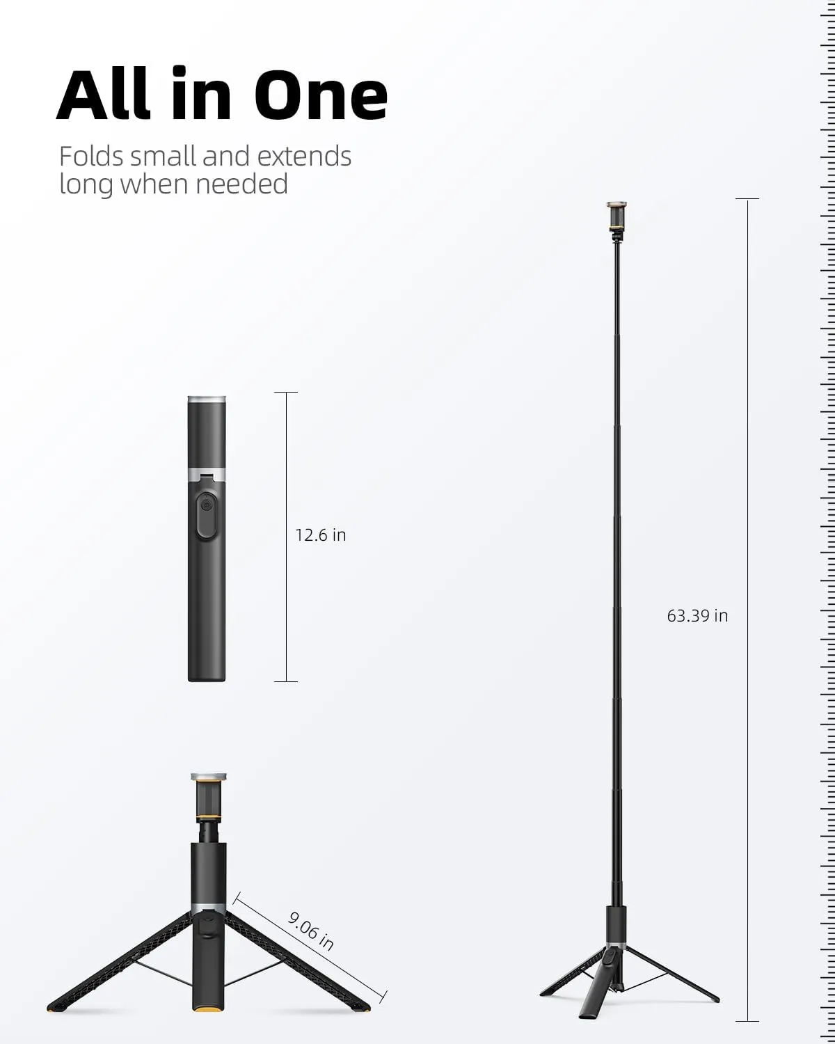 Selfie Stick Tripod All-in-one Design: Our Portable Tripod boasts an advanced and compact engineering, providing the utmost in portability and space-saving design. Effortlessly fold and store it in a mere second, guaranteeing your travel convenience