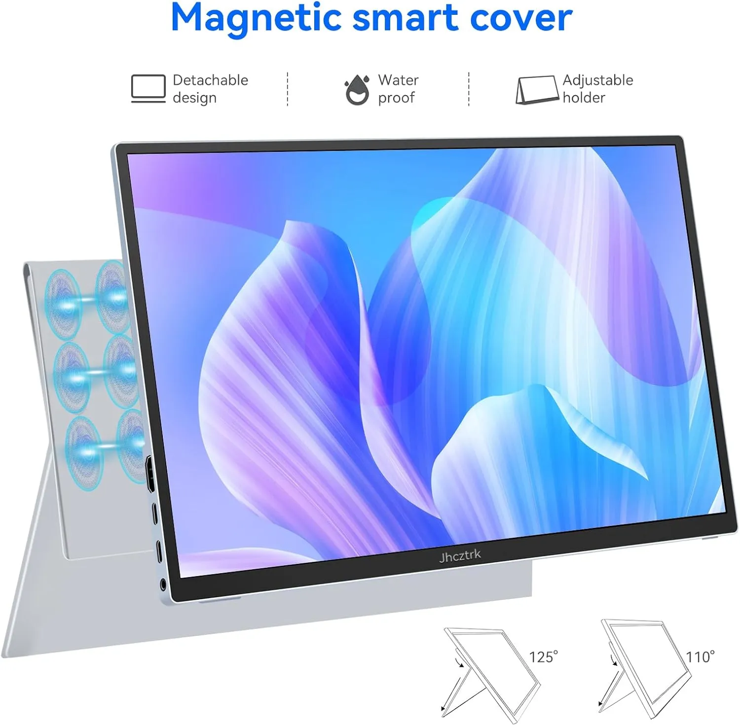【Smart Protective Cover and Dual Speakers】Jhcztrk features a sturdy PU leather case with a smart protective cover that protects the display and can be used as a stand. With 2 openings on the cover, you can adjust your favorite viewing angle. It meets the different needs of use. In addition, this portable monitor comes with built-in speakers, so you can enjoy clear sound without the need for an external stereo!