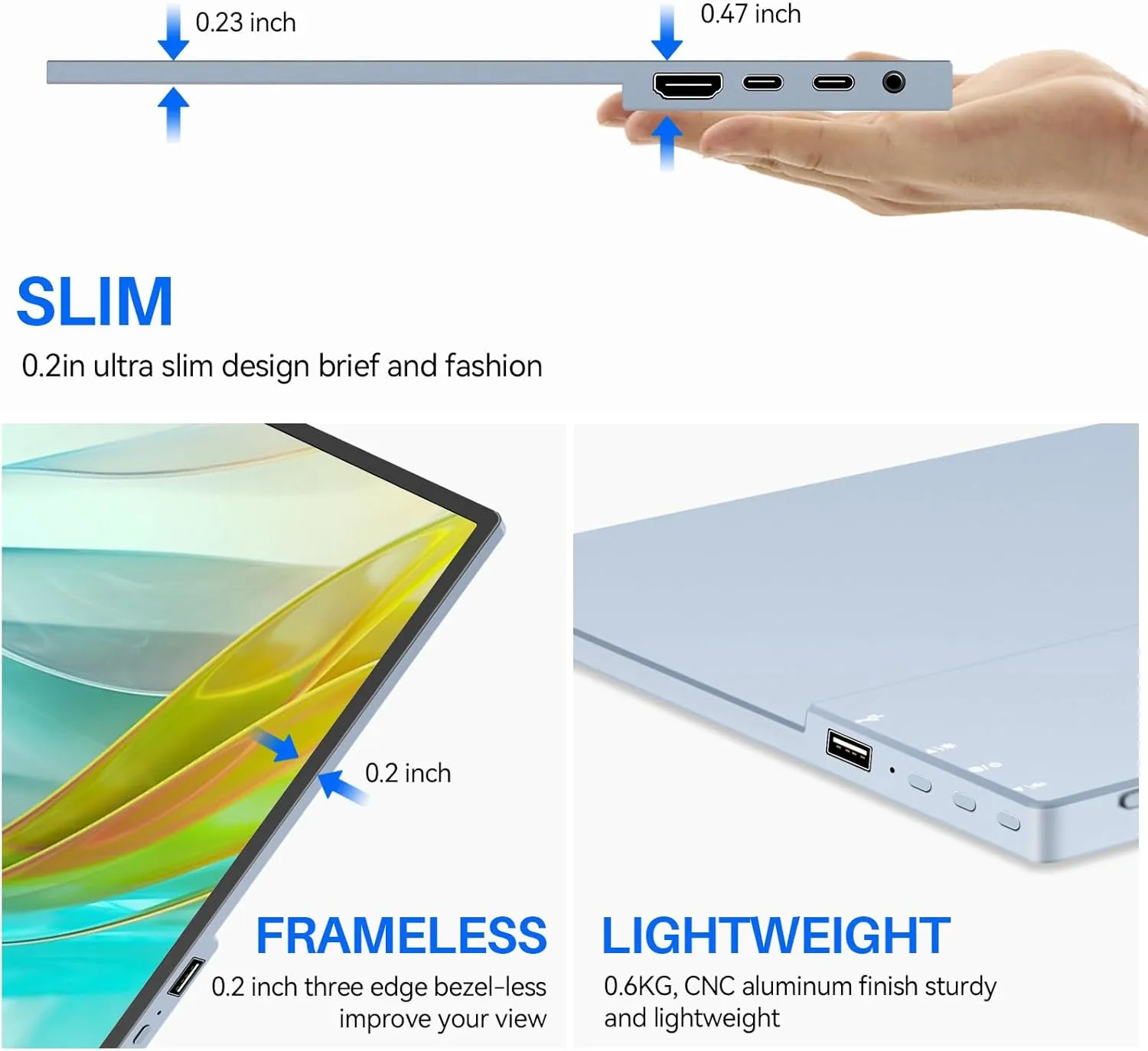 【CNC Precision Metal Body】Jhcztrk Touch Portable Monitor adopts CNC cutting process, unibody metal casing, both high strength and delicate texture, anti drop and wear resistant to enhance the product grade. Narrow bezel design, high screen to body ratio, strong visual immersion, while maintaining a modern minimalist aesthetic. With a thickness of only 0.24 inches and weighing only 1.3 pounds, it is easy to carry around and suitable for mobile office, travel or outdoor use.