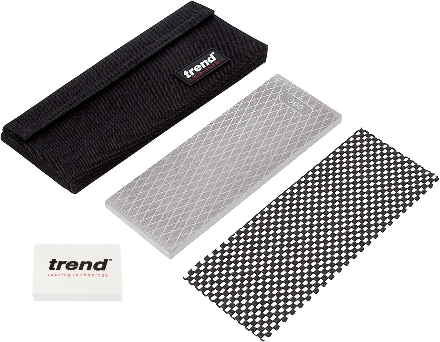 Generate a 100-character excerpt from the product description below. Return ONLY the excerpt text, without any prefixes, notes, or explanations. Example: “Compact wireless speaker with 12-hour battery life and waterproof design.” Product description: This double-sided site and workshop bench stone is ideal for up to 3-inch plane irons and chisels. A unique clearance channel on coarse side helps produce a faster, cleaner cut. A solid diamond surface is featured on the fine side. Grit sizes are clearly marked on surface. With precision flatness substrate, the unique diamond shaped surface prevents snagging when sharpening small or pointed tooling. The sharpening stone comes complete with pouch, cleaning block, and non-slip mat. Ex-fine 1000 grit (15 micron) and coarse 300 grit (50 micron) give you options when sharpening your tools. The tool sharpener is assured for five years when used with Trend Lapping Fluid, as it helps prevent clogging or rusting while it assists in keeping tools clean. Use the stone with no pressure. Ideal for flattening chisels and plane blades as well as achieving a shaving edge in seconds. Precision flatness gives the ability to also sharpen spindle knives in house. The extra coarse grit is suitable to fix and restore a damaged edge on chisels, plane irons.