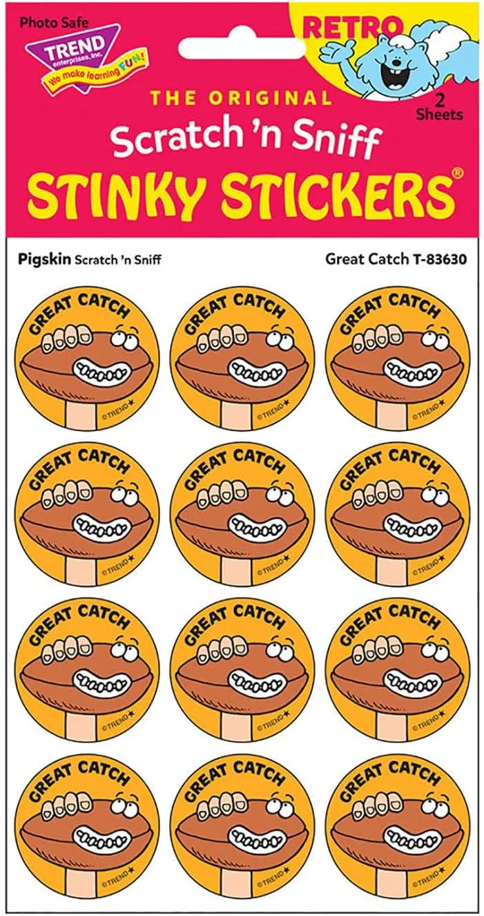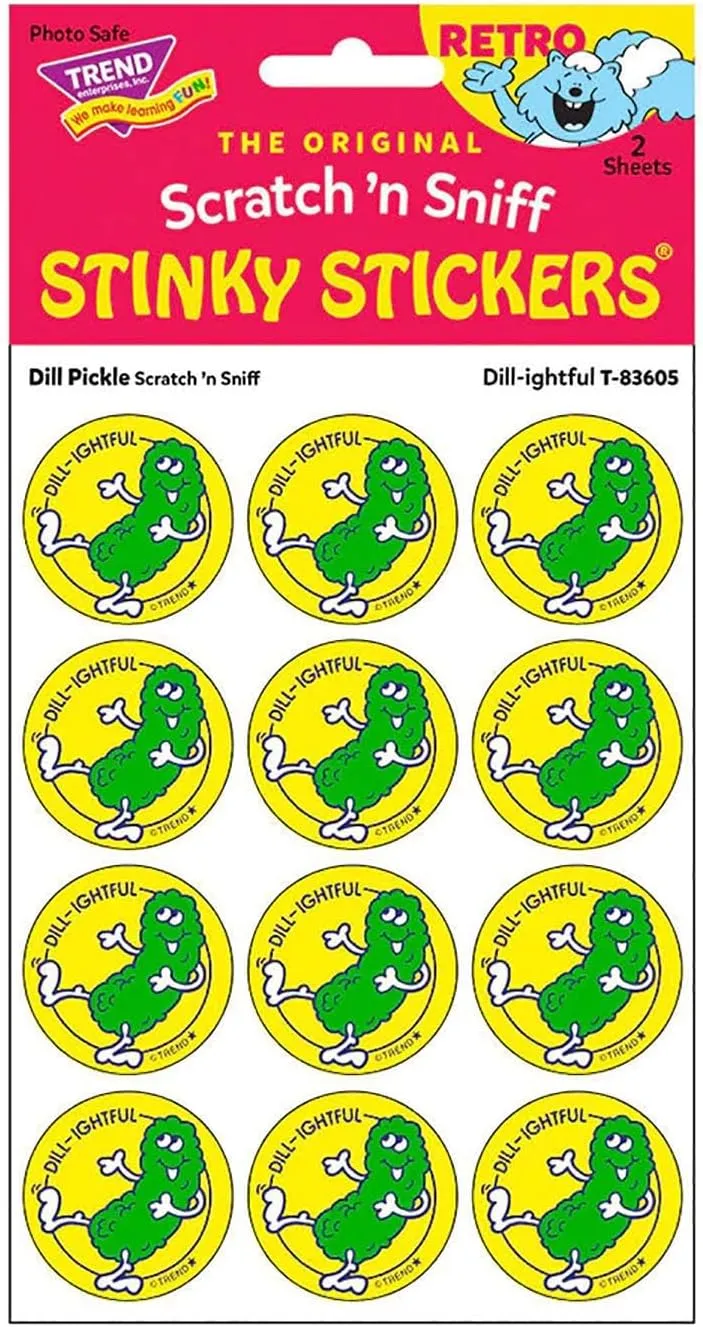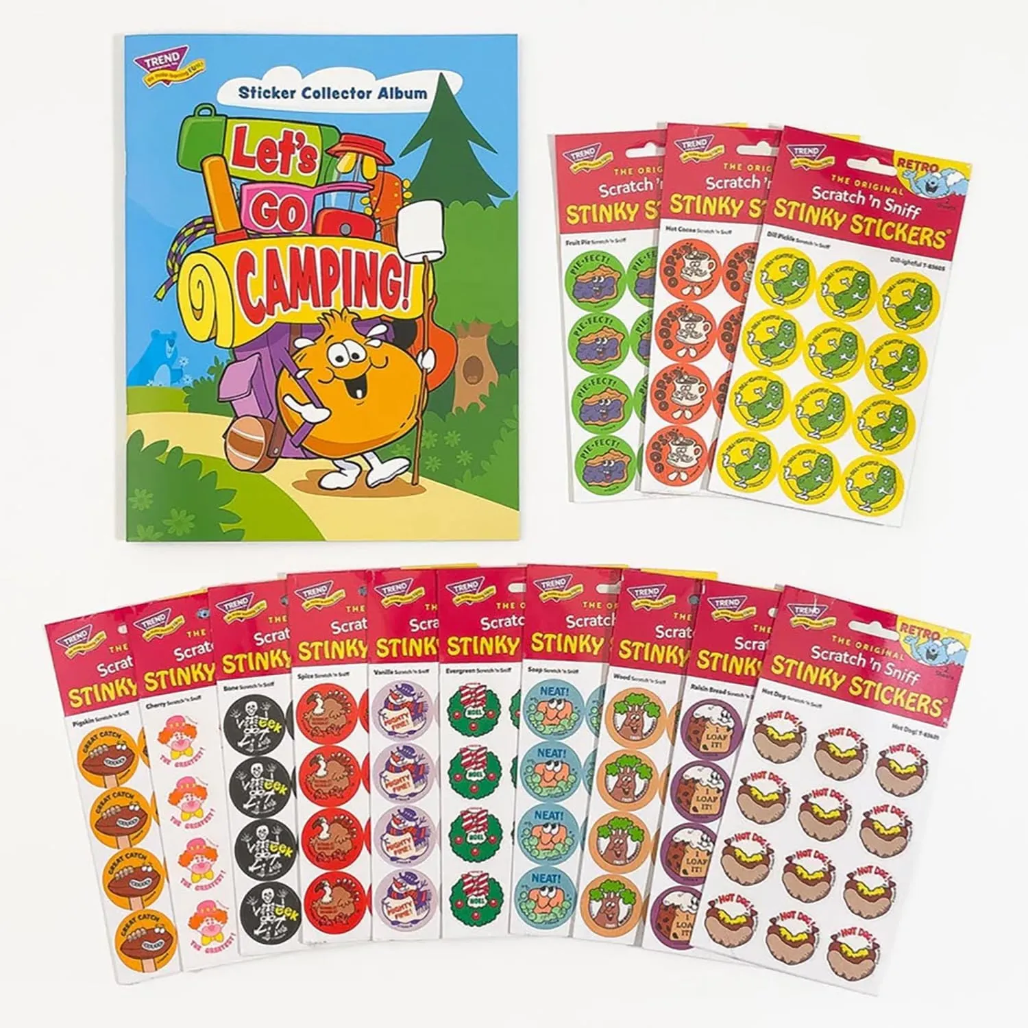 Get a whiff of this! TREND Scratch ‘n Sniff Stinky Stickers from the ’80s are BACK! And they’re SCENT-sational! This set includes one pack each of the thirteen Spring 2024 Retro Stinky Stickers: Dill-ightful, Great Catch, Hot Dog!, I Loaf It!, Neat!, Oops, Pie-fect!, The Greatest!, Tree-mendous!, eek, Gobble! Gobble!, Mighty Fine!, and Noel, plus one 16-page Let’s Go Camping Sticker Collector Album. Each individual pack includes 24 stickers. BONUS: This set includes the Spring 2024 Retro Scratch ‘n Sniff Stinky Stickers® Collector Sheet.