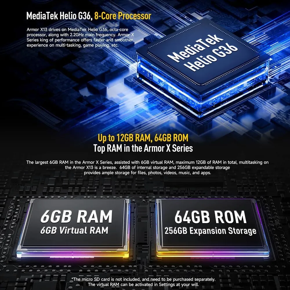The Armor X13 utilizes the MediaTek Helio G36 octa-core chipset, delivering optimal performance and power efficiency. This chipset ensures a smooth and responsive user experience while maintaining efficient power consumption.