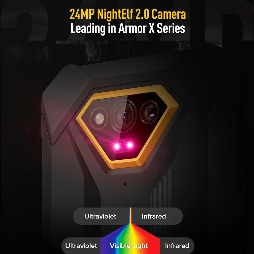 📷【50MP Main Camera + 24MP NightElf 2.0 Camera】Experiencing a cutting-edge camera in the Armor X Series, Armor X13 adopts S5KJN1 CMOS sensor, which brings 50 millions pixels. And Armor X13 is the first model that adopts brand new night vision camera in the Armor X Series. With stronger infrared sensor and higher NightElf 2.0 algorithm and lower interference, Armor X13 can shoot sharper and clearer images either for photography in low light and night scenes or wildlife observation.