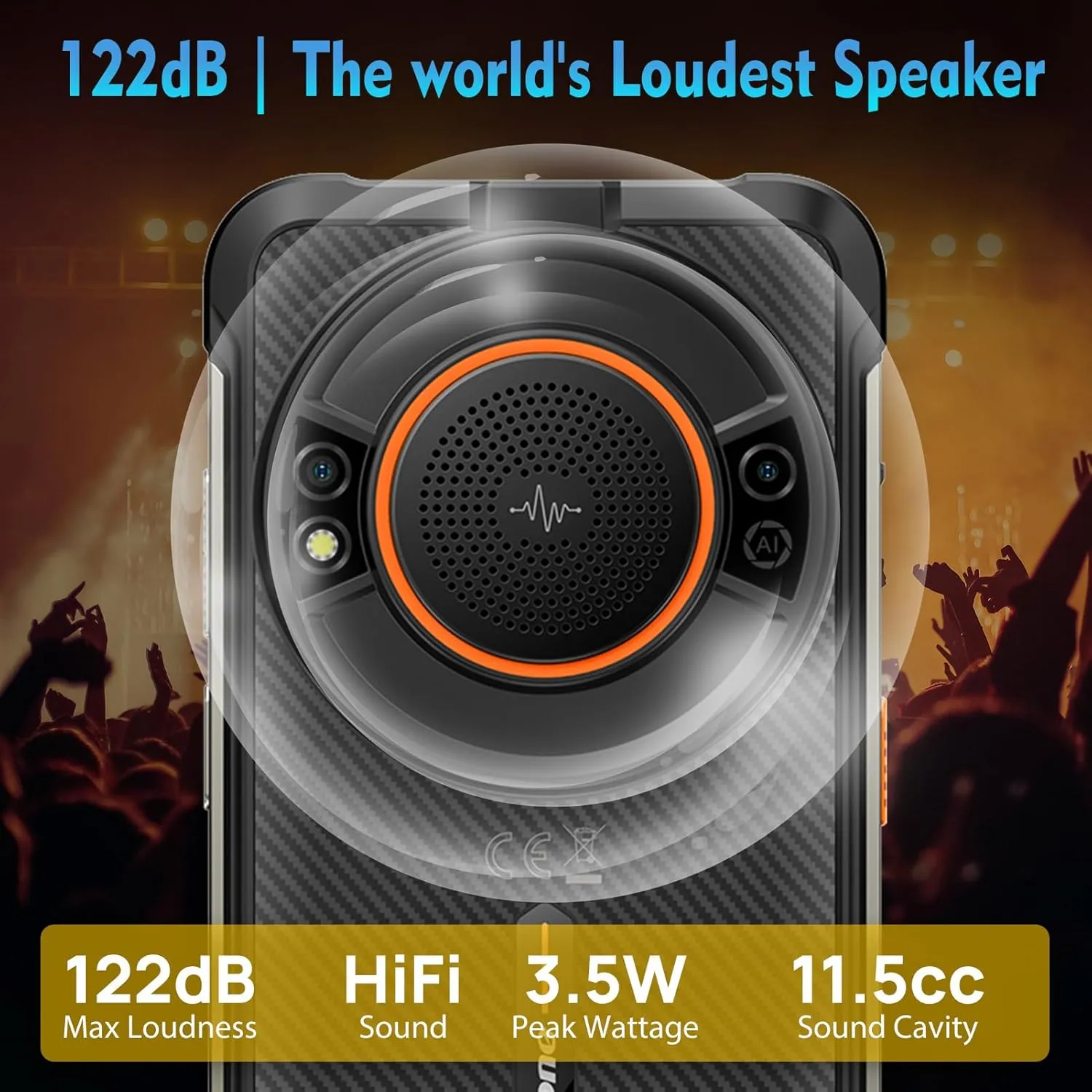 【HiFi Quality Loudest Speaker】Power Armor 16S rugged phone has a diameter up to 36 mm and bulky 11.5 CC sound cavity. With 3.5W rated power, up to 122dB loudness, it is precedented!