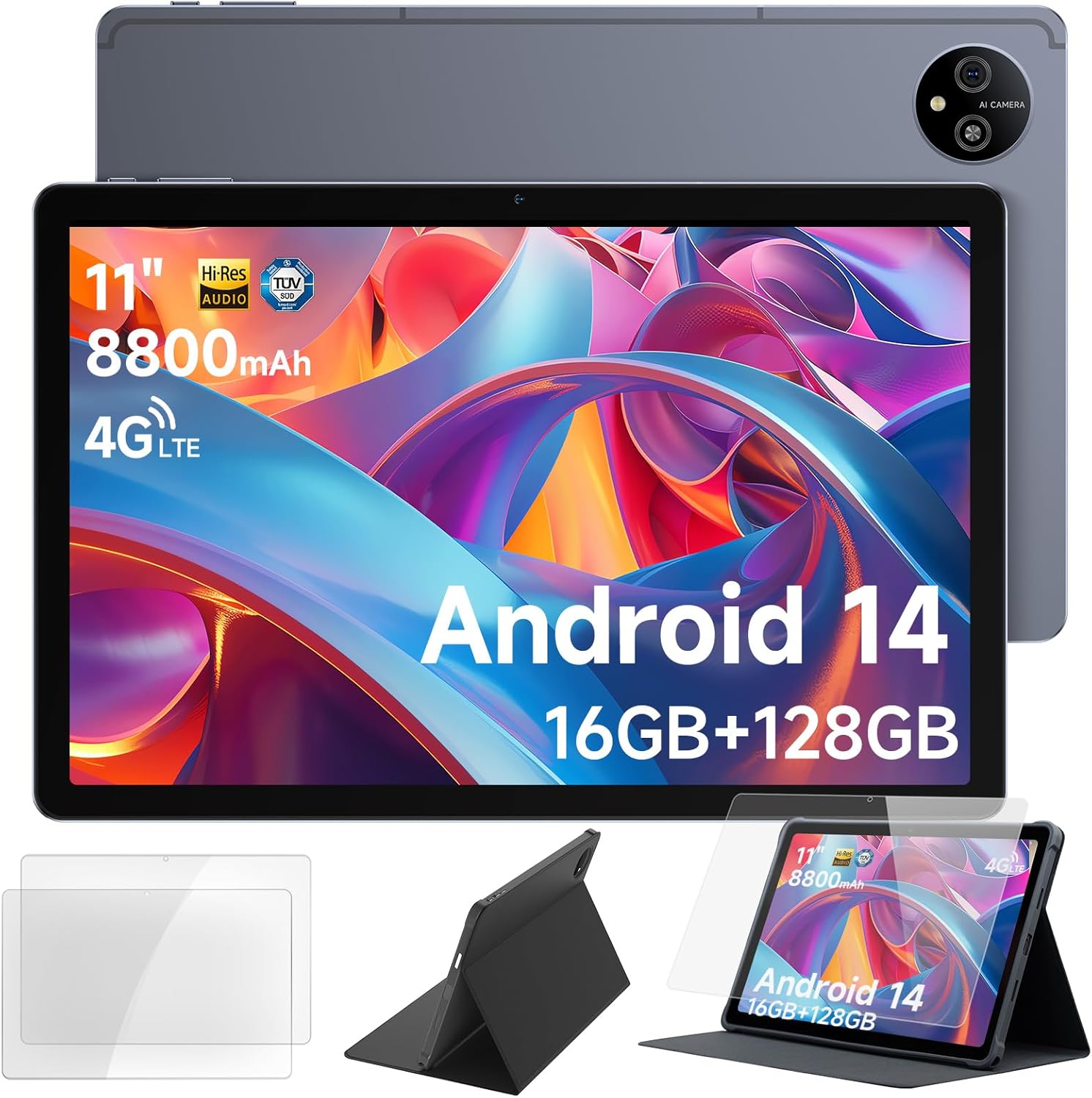 Ulefone Tab A11 Pro Android 14 Tablet, 16GB RAM + 128GB ROM Tablets, 11″ Large Screen 8800mAh, 16MP + 8MP Widevine L1 Quad Stereo Speaker Gaming Tablet, Comes with Tempered Glass and Smart Book Cover