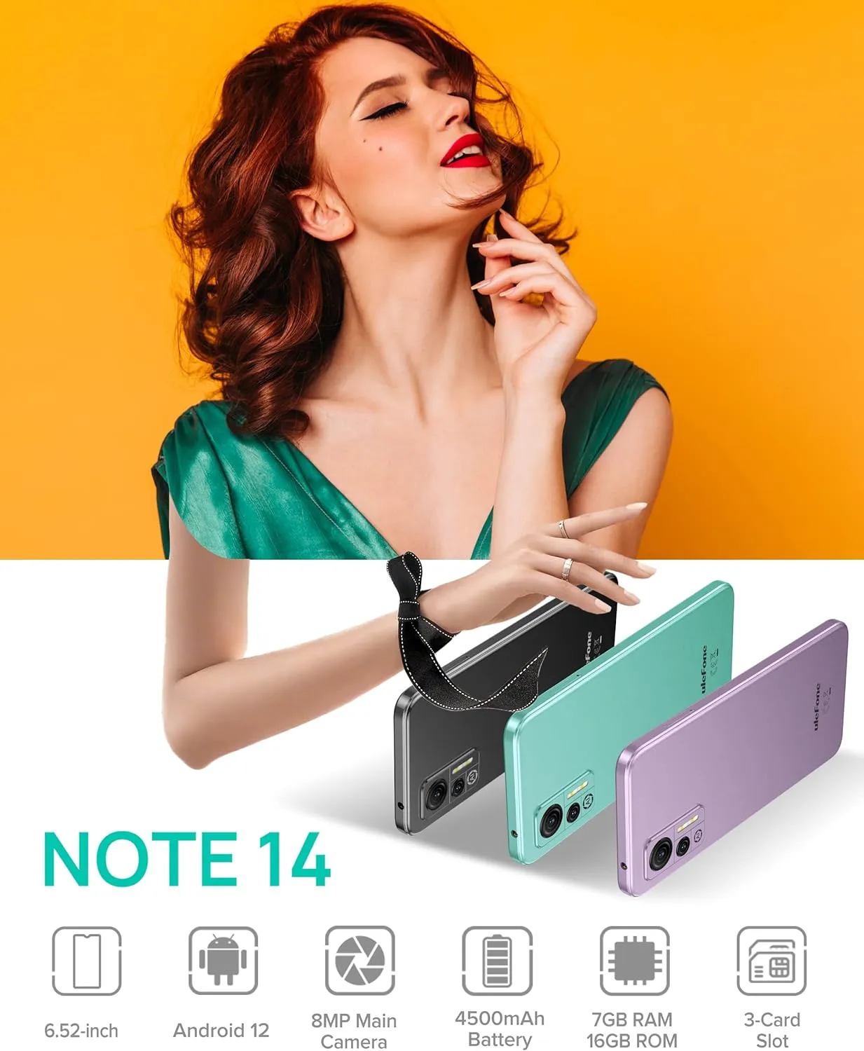 Ulefone Unlocked Smartphone, Note 14 Cell Phone Unlocked, Android 12, 6.52″ IPS Full-Screen, 4500mAh, 7GB + 16GB, 3-Card Slots, 8MP Camera, Dual SIM, Face Recognition, 4G Cheap Phones – Green