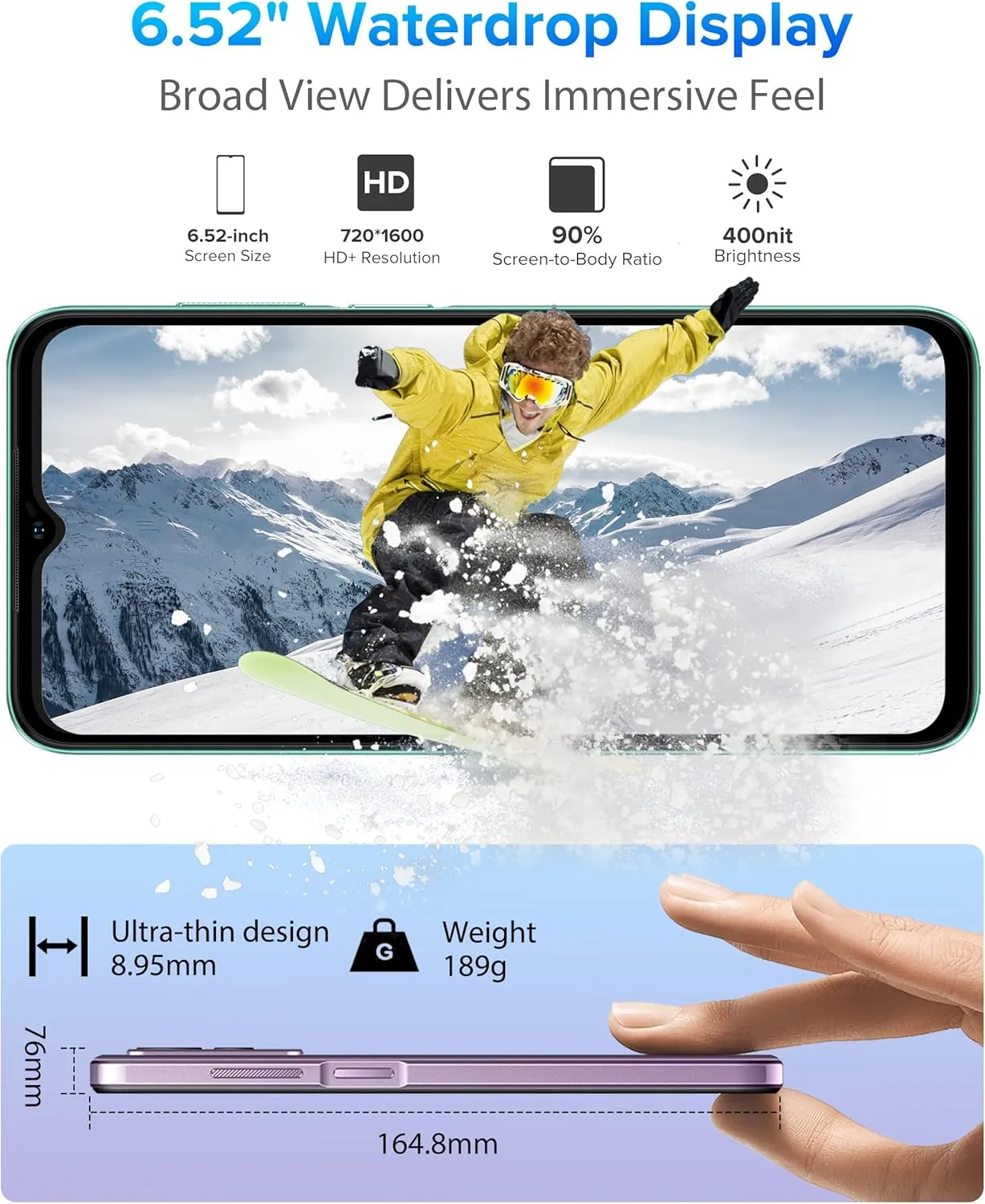 💚 6.52 inch waterdrop HD+ screen, delivers incomparable artistic shades feeling. 8.95mm 3D slim body, 20:9 Aspect Ratio delivers superior hand feel.