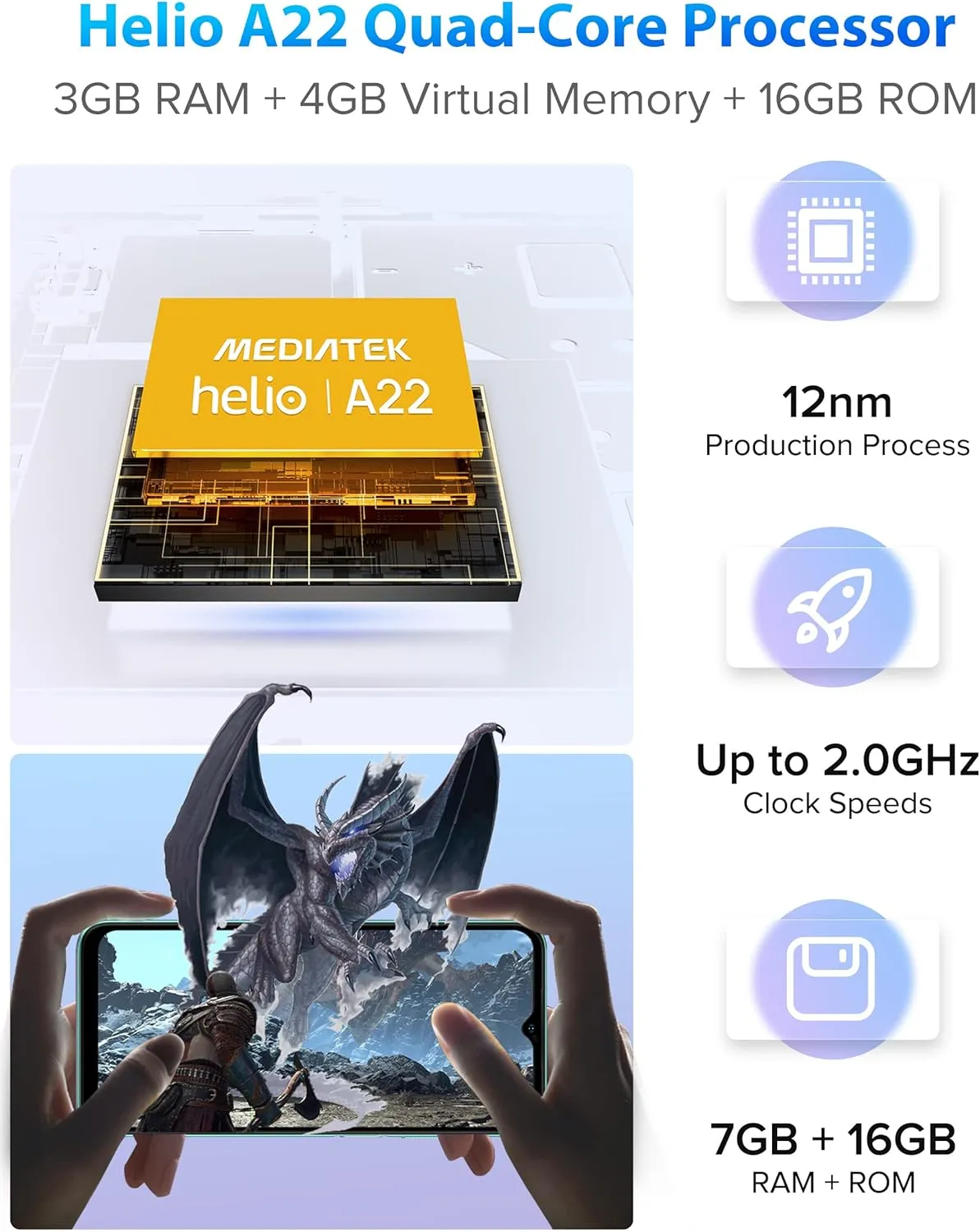 System Android 12 Display 6.52-inch, 720 x 1600 HD+ Aspect Ratio 20:9 Battery 4500mAh Capacity 7GB RAM(4GB virtual RAM) 16GB ROM (support TF card up to 128GB) Card Slot Three card slots, support 2x Nano SIM + 1x TF card Camera 8MP + 5MP Flash 2 Depth Sensor Support Size 164.8*76*8.95 mm Weight 189g Navigation GPS/GLONASS/Beidou/Galileo USB USB Type-C 2.0 Headphone Jack 3.5mm CTIA Other Features Face Unlock, WiFi, Hotspot, Bluetooth, OTG, FM Radio, Cell Broadcast, Gloves Mode, Digital Toolbox Sensor Light sensor, Proximity sensor, Acceleration sensor