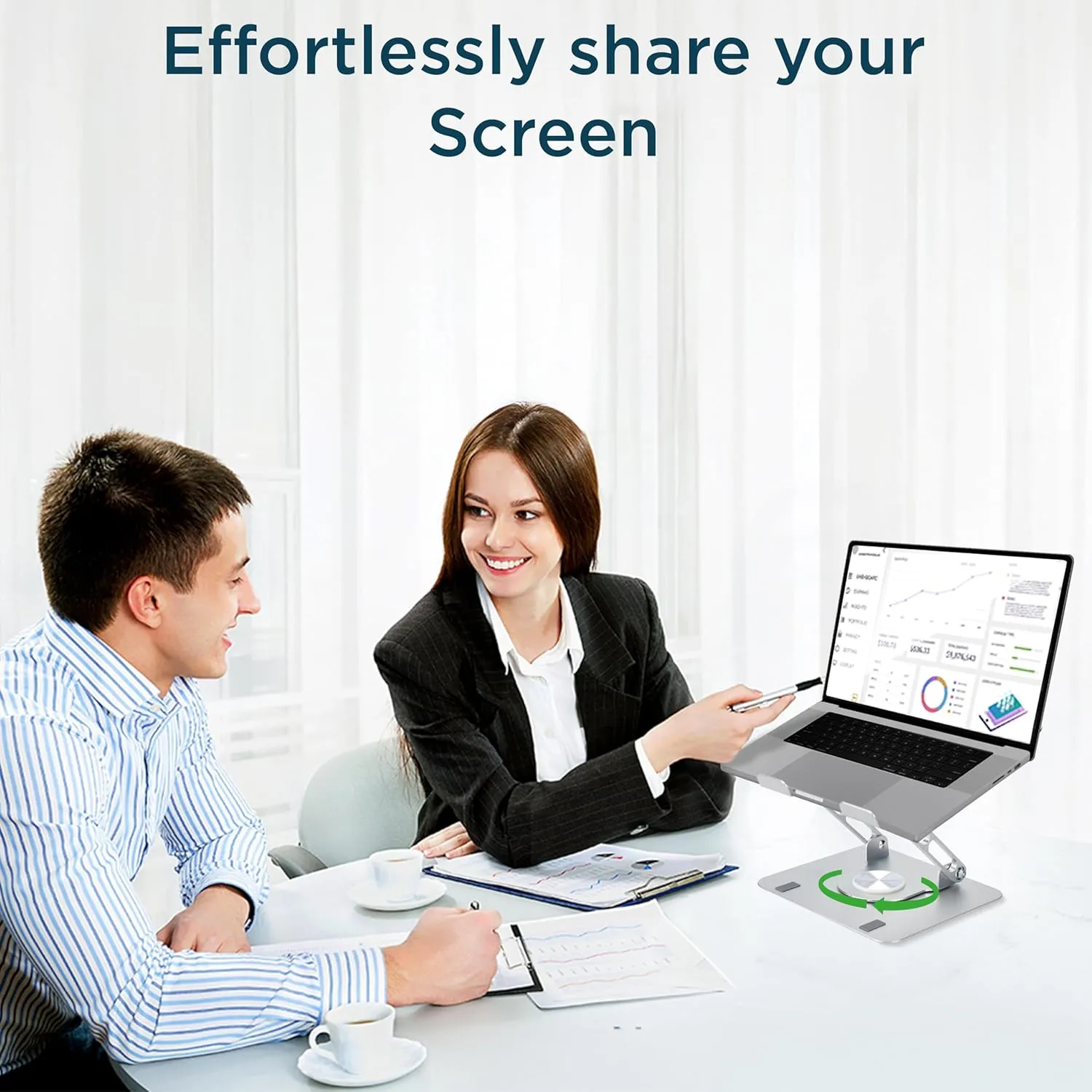 ROTATE: Enhance collaboration and flexibility with a computer laptop stand with 360° rotation, perfect for designers, presenters, and remote workers sharing screens effortlessly.